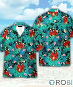 Ladybug In Tropical Green Leaves Hawaiian Shirt features