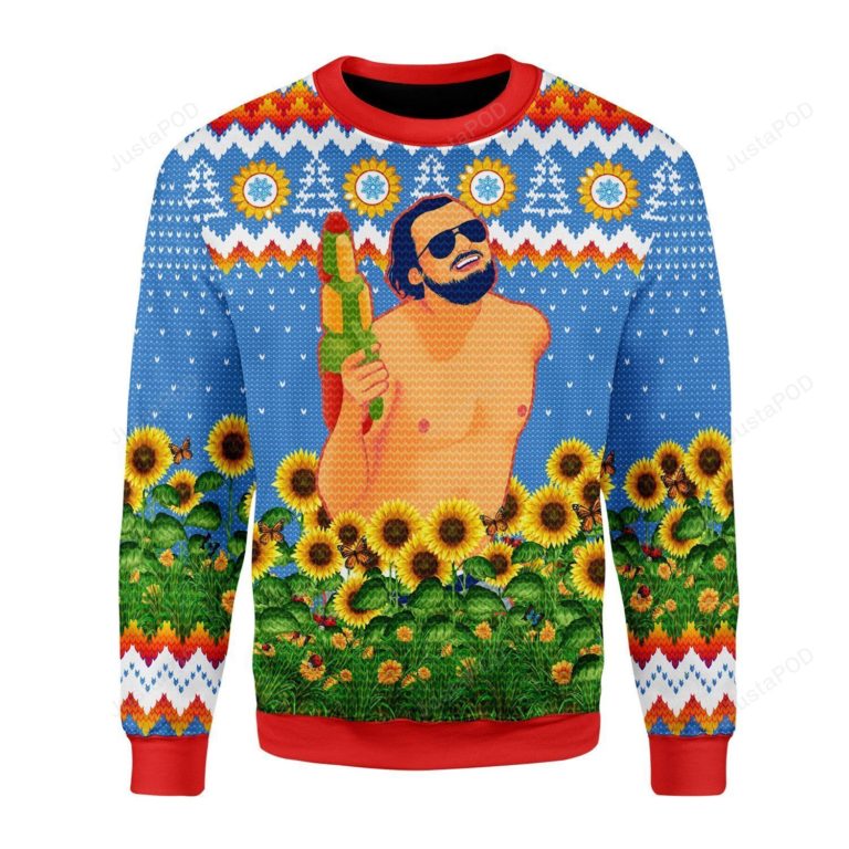 This Leo Running With Water Gun For Unisex Ugly Christmas Sweater available in adult and youth size.