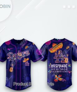 Experience the vibrant fusion of culture and baseball with this unique jersey design, celebrating National Hispanic Heritage Month. The intricate details of colorful guitars, sombreros, and traditional patterns paint a lively picture of Hispanic heritage intertwined with the spirit of the Dodgers. It’s more than just a jersey; it’s a tapestry of tradition and team pride. Ready to wear your passion? Grab yours today and join the celebration!
