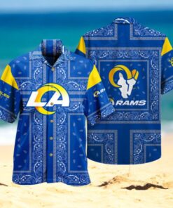 Elevate your wardrobe with our exclusive LA Rams themed shirt, a stylish homage to your favorite team, fusing athletic fervor with luxurious Hawaiian vibes. Crafted for the true Rams fan, this shirt boasts an intricately designed bandana pattern that mirrors the team’s vibrant spirit, ensuring you stand out at every tailgate and beach gathering. The rich blue fabric not only captures the essence of Southern California's elegance but also offers unmatched comfort and breathability, making it a must-have for both game days and casual outings. Embrace this unique blend of sporty charm and tropical luxury, and wear your pride in style!