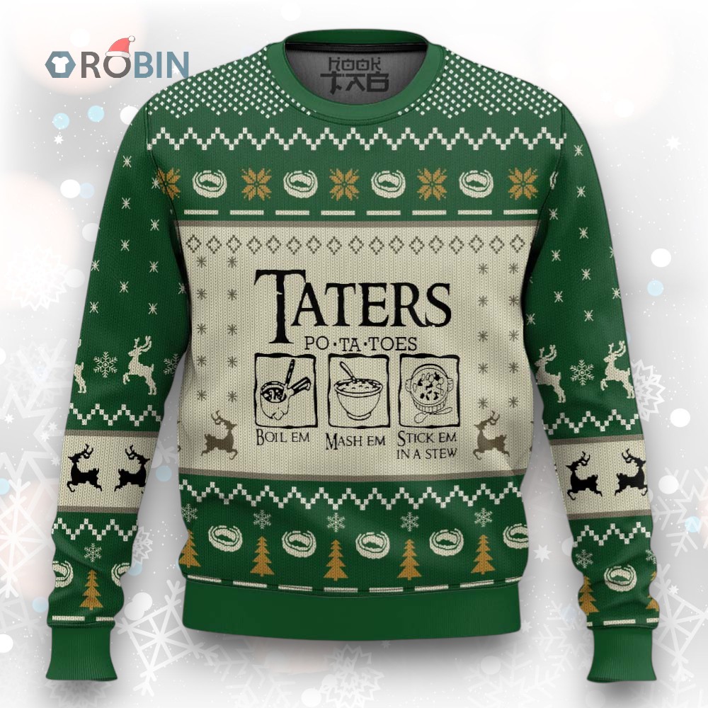 Okay, here's a Twitter post within those guidelines: 😂 This holiday season, declare your love for second breakfast & festive spuds! Get ready to slay the ugly sweater game with this hilarious, geeky design. Perfect for any Tolkien fan with a sense of humor. Get yours before they're all gobbled up! 🥔🎄