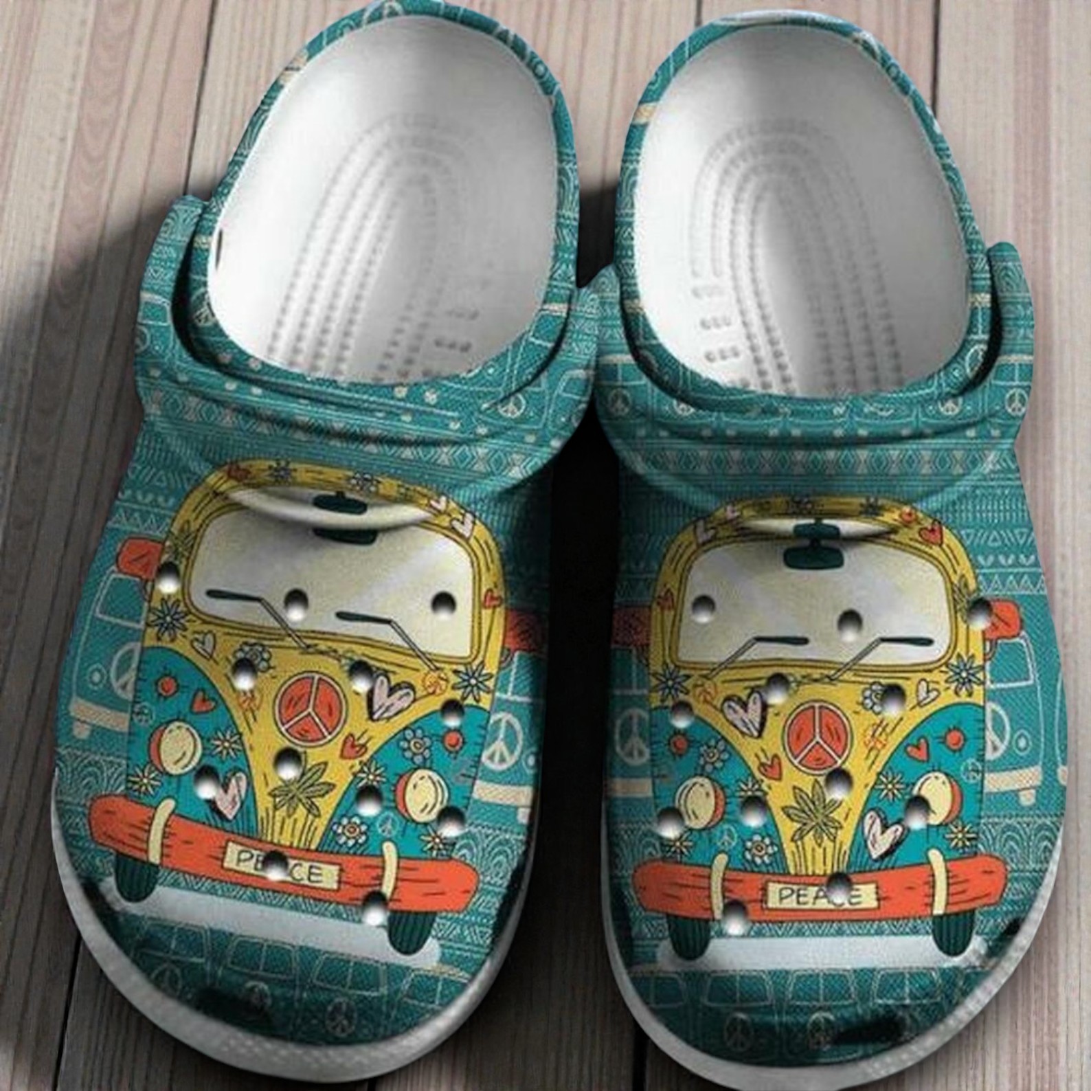 If your perfect weekend involves hitting the road with the windows down and some classic 70s rock playing, these are basically made for you. We designed this pair right around a vintage yellow VW-style camper van totally decked out in retro flowers, hearts, and a classic "PEACE" license plate. The background pulls it all together with a dark teal, boho-inspired tribal pattern mixed with tiny peace signs. It brings a huge wave of nostalgia and is just a really fun pop of color for your casual outfits.