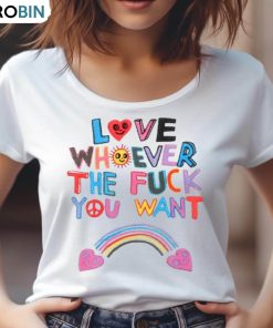 Love Whoever The Fuck You Want Shirt is a bold and stylish t-shirt that promotes body positivity and the freedom to choose who you love. This t-shirt is showcased on a classic white background with vibrant colors and the phrase boldly stitched with a classic font. The t-shirt is made out of a comfortable and breathable fabric that will keep you cool and comfortable while showing off the belief in sexual fluidity. This unique and empowering t-shirt is perfect for those who want to show their support and love for all people regardless of sexual orientation. It's a great way to show a bit of self-confidence and pride in making up your own mind.