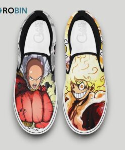 Gear up your feet with these awesome slip-ons! Featuring designs inspired by two of the strongest heroes: One Piece's rubber-man pirate and the Caped Baldy himself! Comfy, stylish, and perfect for any anime fan. Get yours now and walk the path to becoming a hero!