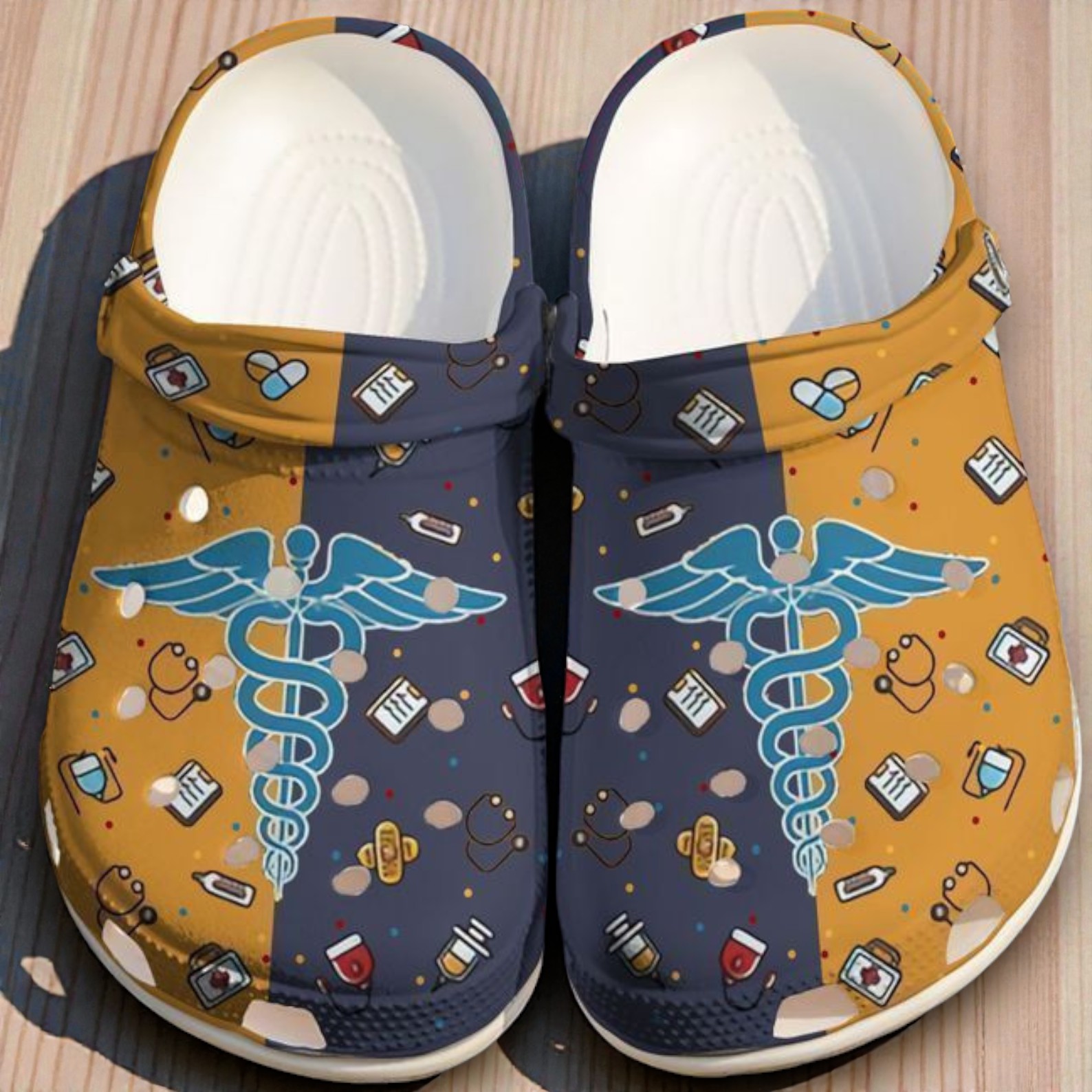 Add a bit of personality to your work uniform with these custom medical clogs. The design features a bold split-color look, mixing mustard yellow and navy blue. The center highlights a large blue Caduceus symbol—the classic sign of medicine—surrounded by a pattern of small icons like stethoscopes, pills, and first-aid kits.