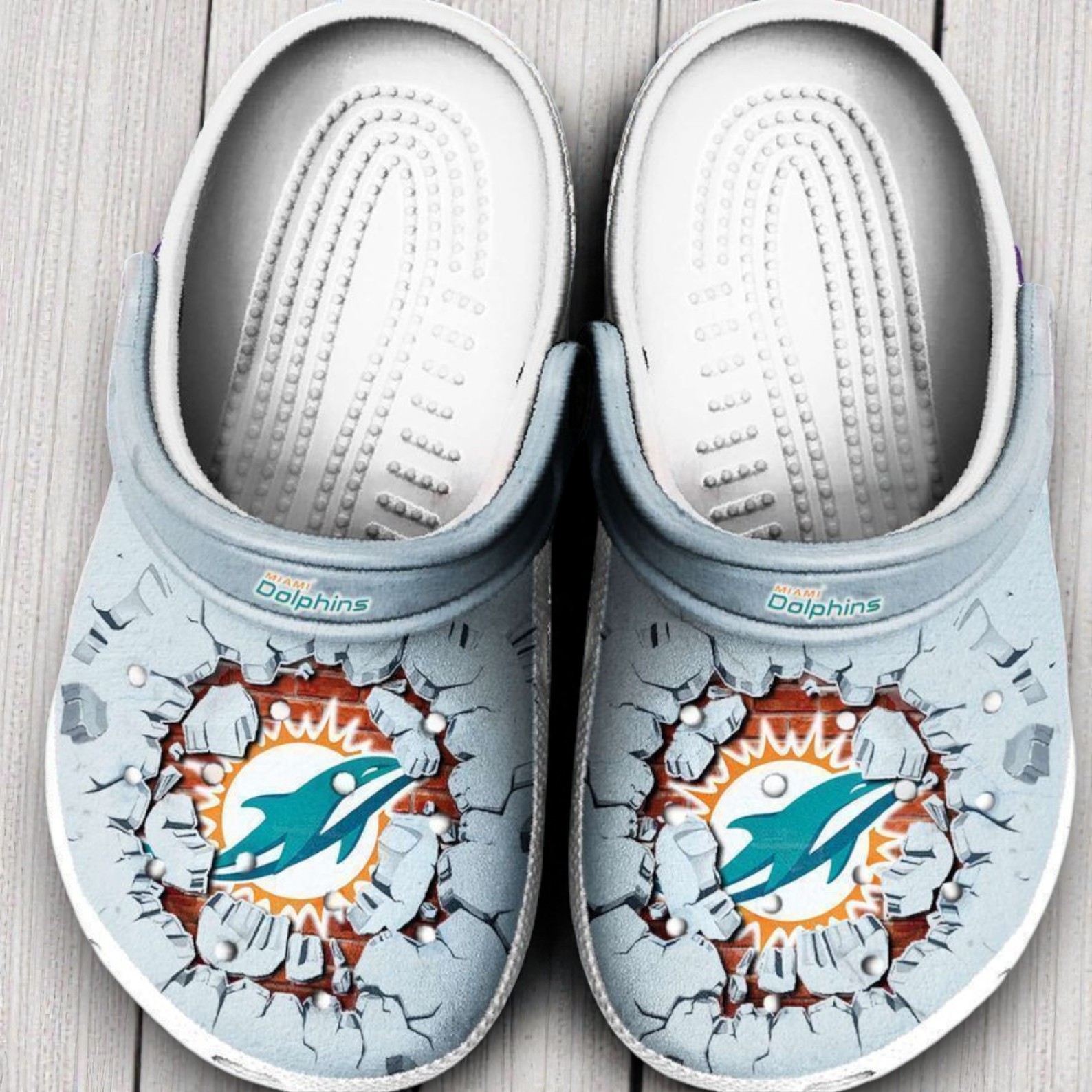 If you live for Sunday football and the Fins, these Miami Dolphins Crocs are a game-day essential. The design features a cool 3D "broken wall" effect, making it look like the iconic Dolphins logo is smashing through a concrete barrier to get onto the field. It’s a bold, high-energy look for any dedicated fan who wants to represent their team from head to toe.