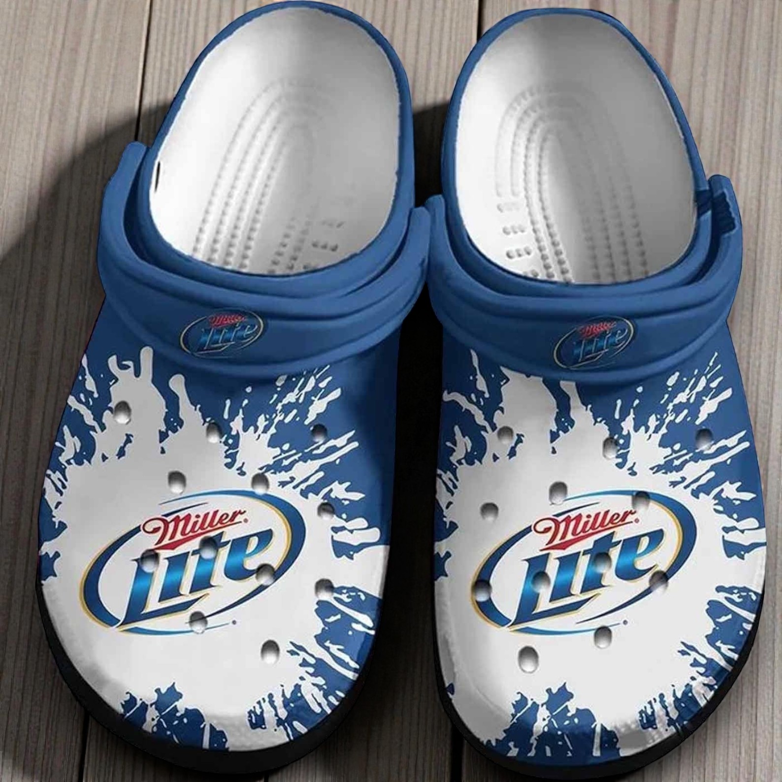 The deep blue base of these clogs catches the eye immediately, punctuated by lively splashes of white that ripple across the surface like frothy waves. The Miller Lite logo, rendered in a sleek script paired with bold sans-serif, stands out clearly, balancing a playful energy with a sporty edge. This is a design that doesn’t shy away from making a statement but does so with a casual, unforced confidence. These Miller Lite custom shoes clogs channel a vibe that’s at once fun and laid-back, perfect for someone who wears their beer enthusiasm like a badge of honor. They hint at weekends spent on backyard patios, laughter with friends, and the kind of easy style that blends sportiness with humor. The graphic elements aren’t overwhelming but precisely placed to strike that humorous yet confident note. Pair them with relaxed cargo shorts, a simple tee, and a baseball cap for effortless summer downtime. Alternatively, they add an unexpected pop to classic jeans and a casual button-down. Ideal for dads who appreciate a nod to their favorite brew, these clogs become more than footwear—they’re a lighthearted extension of personality and taste. A husband known for his easygoing approach and unmistakable sense of humor would quickly claim these for weekend wear. Whether gifted for Father’s Day or just because, these clogs carry with them a blend of familiarity and cheeky fun that feels perfectly suited to anyone who enjoys the Miller Lite lifestyle without taking things too seriously.