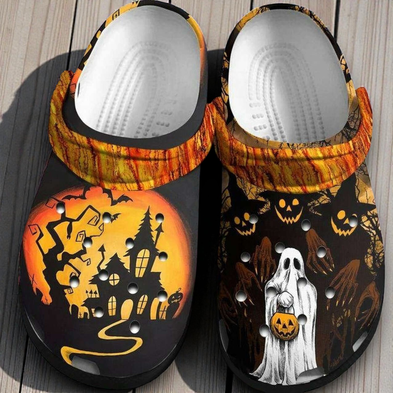 If you are the type of person who starts decorating for October weeks in advance, you will love having these sitting by your front door. We went with a fun, mismatched design for this pair to give you two distinct spooky scenes. The left shoe features a classic dark haunted house against a glowing orange full moon, while the right shoe highlights a little ghost trick-or-treating with creepy pumpkin ghouls lurking in the background.