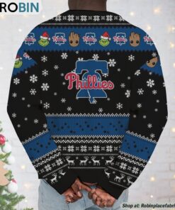 Step into a world of whimsical sports fandom this holiday season with a sweatshirt that tells a story of unlikely friendship and team spirit. This eye-catching piece features an adorable fusion of Baby Groot and the mischievous Grinch, bound together by their mutual love for the Philadelphia Phillies. Perfect for fans of all ages, it marries festive charm with team pride. Crafted for comfort and style, it's an essential addition to any holiday celebration, whether you're watching the game or decking the halls. Show off your unique flair and make this the centerpiece of your holiday wardrobe while embracing the joy of the season with a playful touch.