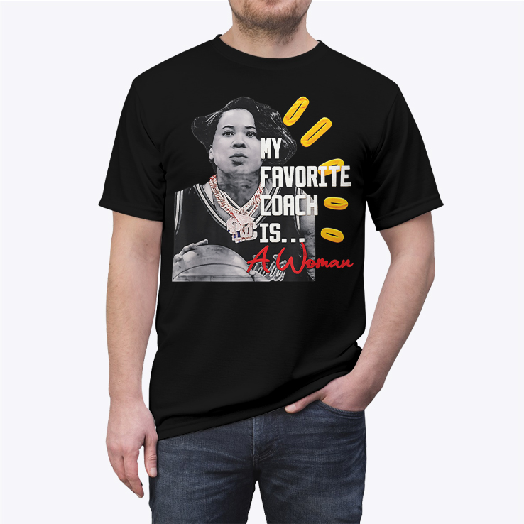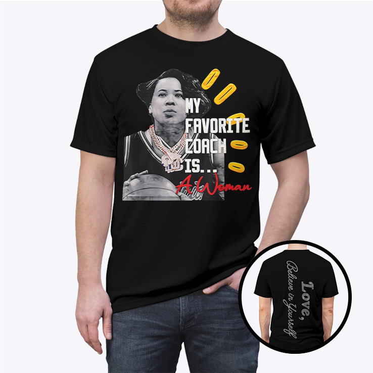 - Front: statement graphic “My Favorite Coach Is… A Woman” with basketball styling and standout accents