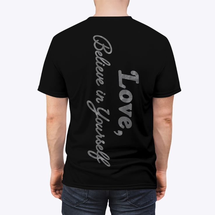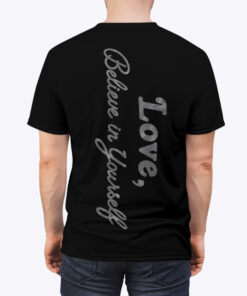 The back keeps the energy going with a clean, vertical script: “Believe in Yourself, Love,”—a quiet reminder that hits hard whether you’re walking into the gym, the arena, or a big day.
