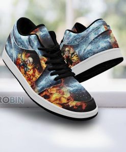 The My Hero Academia Bakugo Fire and Ice Jordan Sneaker is a special limited edition sneaker released in collaboration between My Hero Academia and Jordan Brand. The sneaker features a low-cut design with clean white upper and a unique design, combining the Fire and Ice elements of the popular anime. The midsole is made of light grey foam while the back of the sneaker features a dominant red/orange grip pattern to finish the look. It also features an embossed logo of Bakugo, the main protagonist of My Hero Academia, sitting atop a black grid pattern. Perfect for any anime fan, these sneakers are a surefire way to show your love for My Hero Academia.