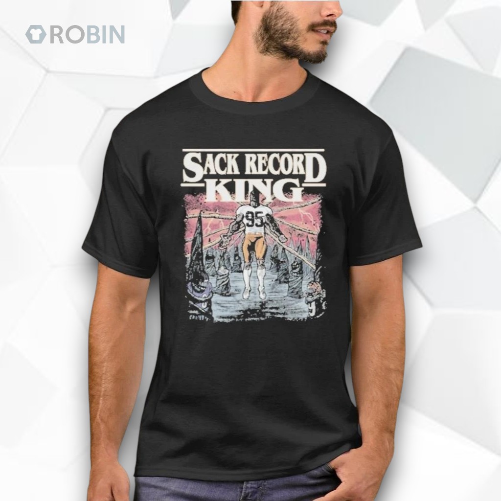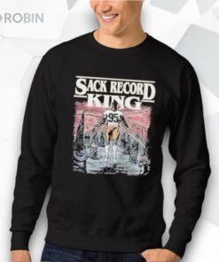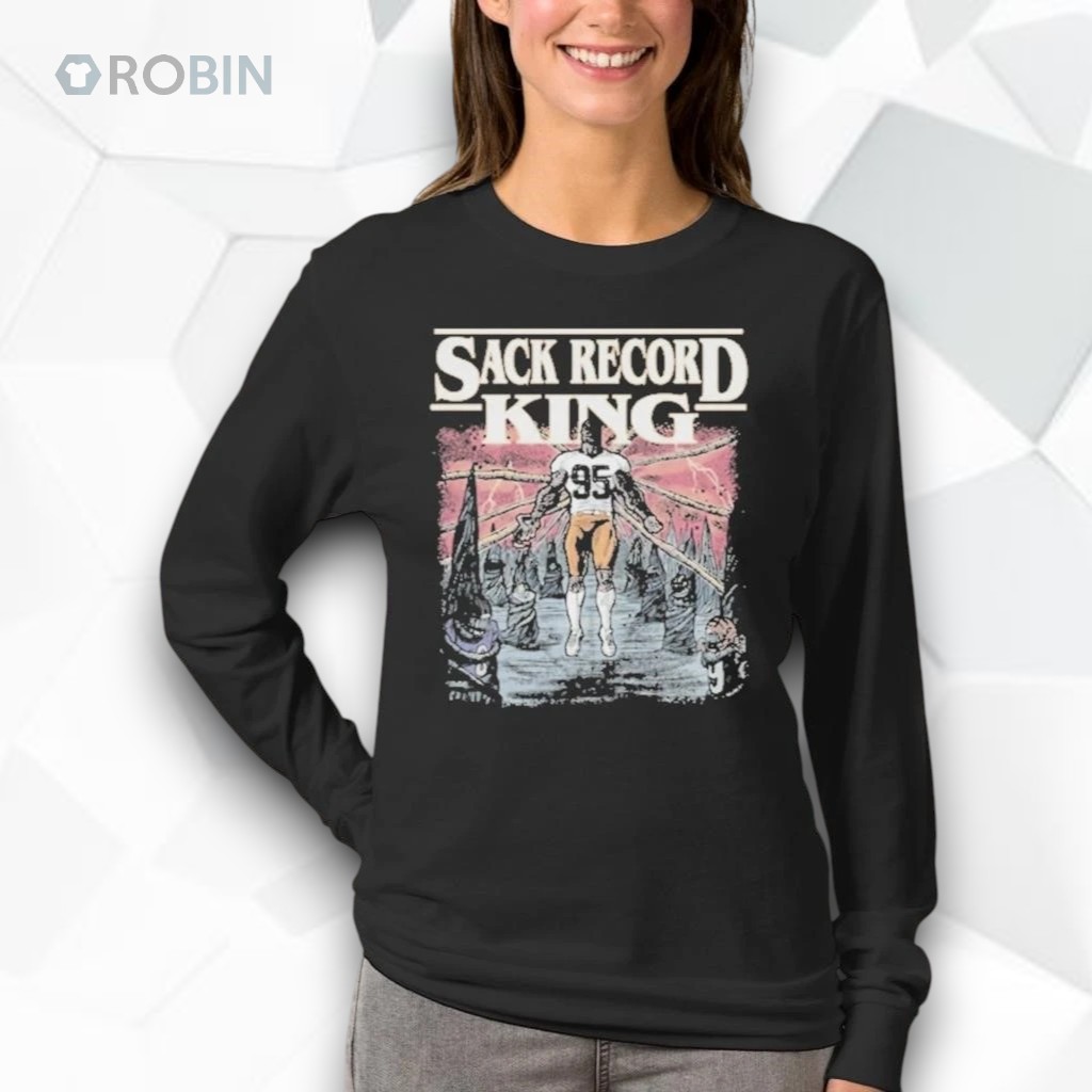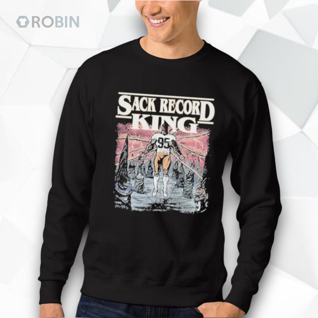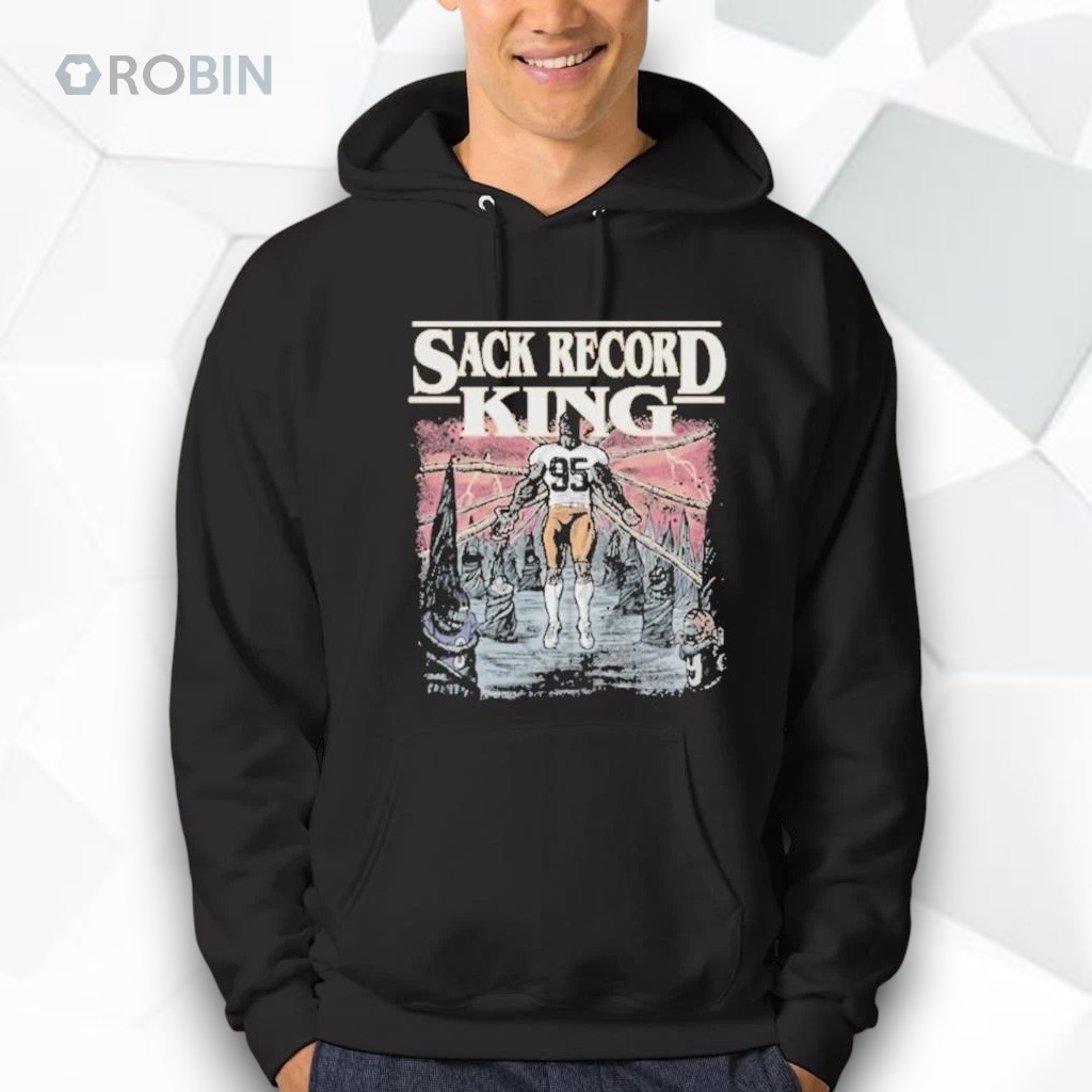 Make a bold statement with this Sack Record King hoodie, a powerful graphic design celebrating absolute dominance on the defensive side of football. Featuring a striking illustration of a legendary #95 figure rising above the field, this hoodie represents strength, fearlessness, and record-breaking greatness.