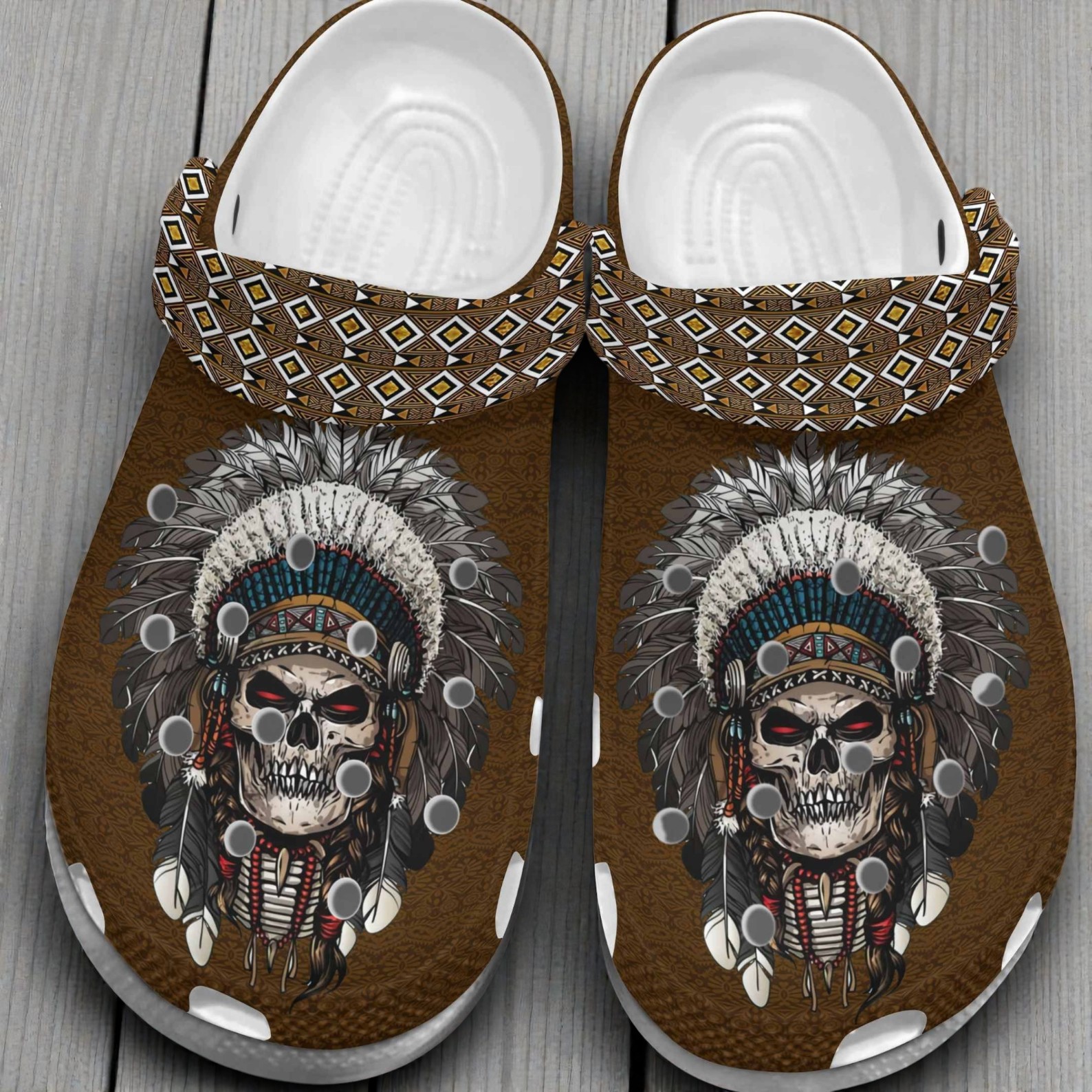 If your daily wardrobe leans a little more edgy, western, or biker-inspired, this pair is going to fit right in. We took a dark brown base with a really cool, subtle tooled-leather texture and put a massive, highly detailed skull wearing a traditional Native American chief headdress right on the front. To finish it off, we wrapped the top strap in a geometric tribal pattern. It’s a bold, gritty look that definitely stands out from standard, solid-color shoes.