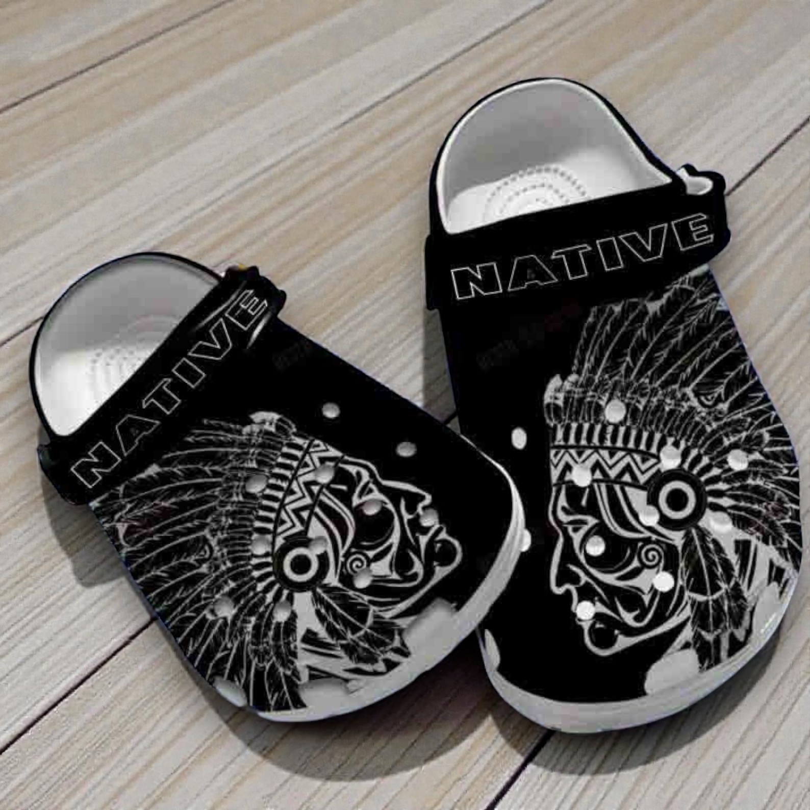 Expression isn’t just about what you wear—it’s a declaration of who you are. These clogs channel that spirit with bold, monochrome tribal artwork that demands attention. The black base creates a striking canvas for white tribal faces and headdress motifs, each line sharp and purposeful, speaking to a legacy of strength and craftsmanship. Across the strap, the word NATIVE appears in bold, outlined uppercase typography, grounding the design in identity and pride. Such a powerful visual tells a story without saying a word, making these shoes more than just footwear. They resonate with those drawn to cultures rich in history and symbolism, people who see style as a meaningful extension of themselves rather than a trend. Whether worn on casual days or carried as a thoughtful gift, these Native American inspired clogs fit naturally into lives that value authenticity and depth. They suit anyone who appreciates tribal art’s complexity and spirit—friends or family who don’t shy away from making a statement rooted in heritage and bold design. This is footwear that connects aesthetics with attitude, inviting wearers to celebrate individuality in every step.
