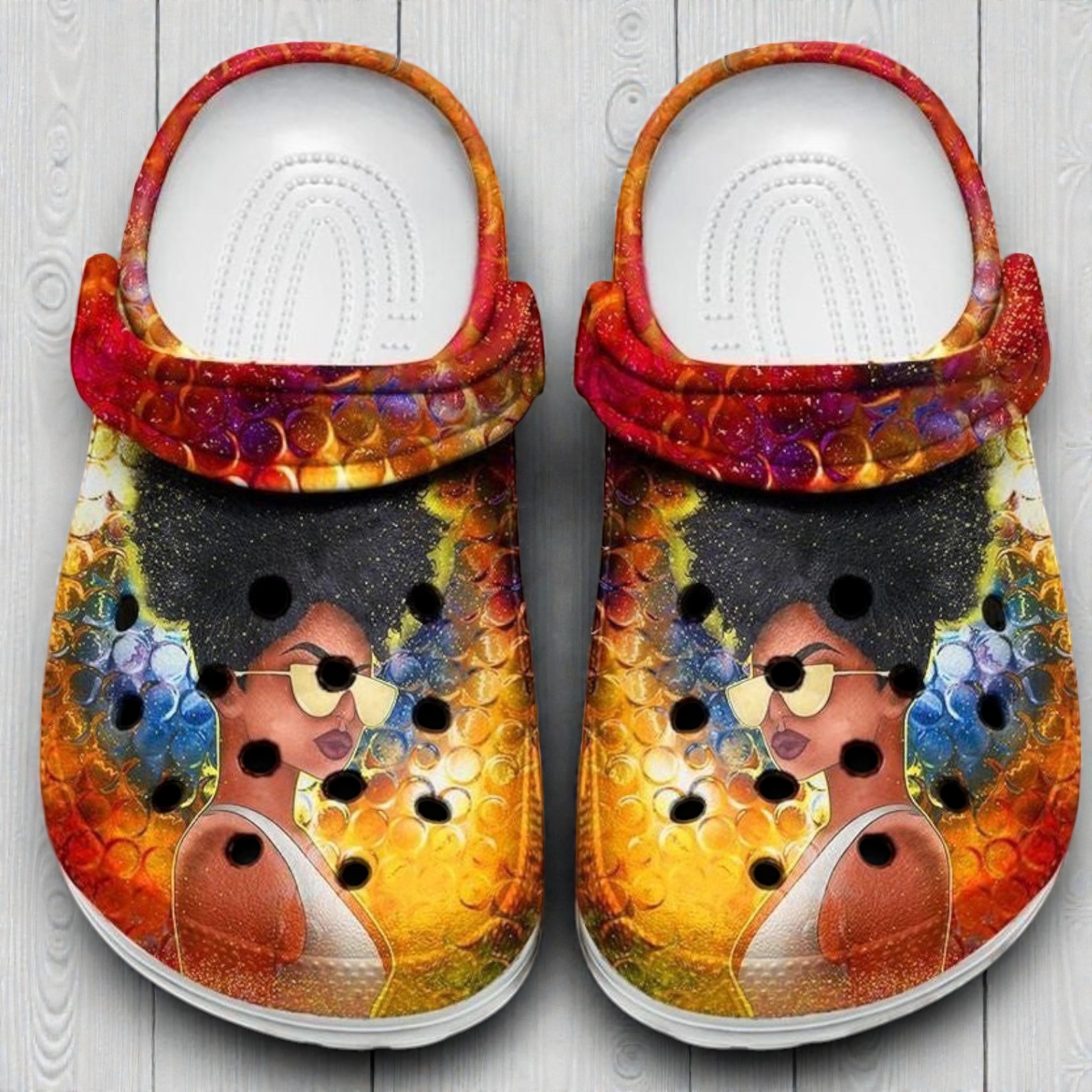 It’s funny how the right pair of shoes can instantly boost your mood, isn’t it? These colorful disco sunglasses shoes bring that kind of energy with their bold retro vibes. At first glance, they catch your eye with a framed portrait of a woman rocking oversized yellow glasses, her hair a sharp black contrast against a lively bubble-patterned background. The warm, gradient colors blend seamlessly with a pop-art glam style that’s impossible to ignore. Circular perforations add texture and breathability, turning ordinary clogs into a statement piece. If you’re someone who loves to stand out in a crowd or appreciates the quirky thrill of vintage disco aesthetics, these shoes will definitely speak to you. They’re not just about comfort; they’re a wearable celebration of confidence and fun. Young adults and fashion enthusiasts who enjoy playful, colorful designs will find these a perfect fit for their casual, everyday looks or even festival outfits. And honestly, if you know a friend who’s all about bold style and personality, these shoes make a brilliant gift. They’re a great way to bring some vibrant fun into anyone’s wardrobe without shouting for attention—they do it effortlessly. Whether worn for a chill day out or to light up a laid-back weekend gathering, these colorful disco sunglasses shoes are about embracing joyful self-expression in every step.