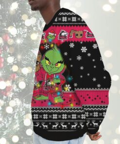 Elevate your holiday wardrobe with this uniquely festive sweatshirt, where the whimsical worlds of Baby Groot and the Grinch come together in a delightful embrace of friendship, showcasing your quirky holiday spirit and team pride. Perfect for fans of playful pop culture mash-ups and a bit of holiday mischief, this sweater is not just an apparel choice but a conversation starter. Imagine the joy and camaraderie it brings in every family gathering or holiday party, spreading cheer and warmth. Whether you're a fan of college sports, love quirky designs, or simply enjoy the playful contrast and charm of these beloved characters, this garment is crafted to infuse your holiday season with comfort, joy, and a touch of unexpected delight.