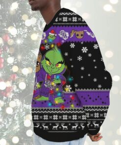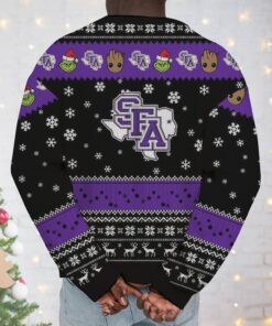 Get ready to celebrate the holiday season in style with a unique twist that combines your love for Christmas and college sports! Our festive sweatshirt features an adorable Baby Groot and the mischievous Grinch, portraying their unlikely yet heartwarming friendship, adorned with Stephen F. Austin Lumberjacks flair. Perfect for fans who want to showcase their team spirit while reveling in the festive cheer, this quirky and eye-catching ugly Christmas sweater will be the highlight of your wardrobe, making it a must-have for any holiday gathering. Don't miss out on this perfect blend of holiday fun and school pride!
