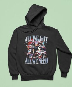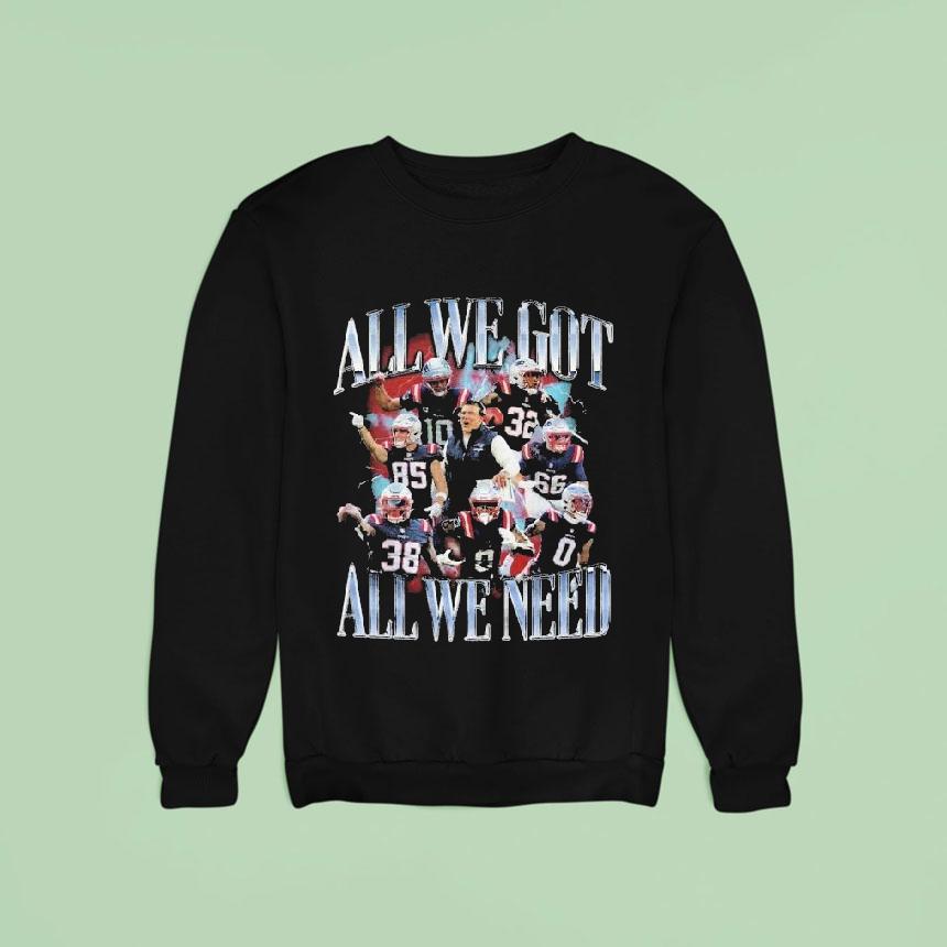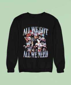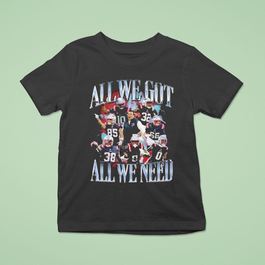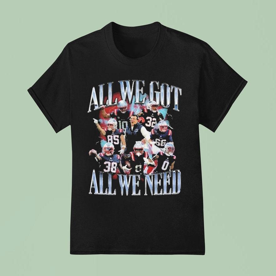 There’s a certain pride in the way New England Patriots fans rally around their team’s grit and perseverance, and this shirt captures that spirit in a bold, no-nonsense fashion. The design layers a collage of well-known players, each figure overlapping just enough to create a dynamic sense of action without losing individual focus. All around them, the phrase “All We Got All We Need” is sprawled in wide, uppercase serif-like letters that feel both classic and commanding. The typography’s weight anchors the energy of the players’ images, giving the shirt a strong, motivational vibe—like a rally cry you can wear. Color contrasts between deep navy and bright white pop against the shirt’s fabric, reinforcing the Patriots’ signature palette without overwhelming the eye. It’s a balanced interplay between graphic complexity and typographic clarity that would resonate with those who appreciate their fandom as part of a bigger identity. Wearing this New England Patriots shirt isn’t just about game day; it says something about perseverance and community that sticks to everyday moments—whether it’s a casual meet-up with friends or running errands where you want a subtle nod to what drives you. This isn’t a graphic tee for the passive fan. It’s for the person who carries the team’s story in their every move, who lives for those highs and lows together. Anyone who finds meaning in that shared ethos would be drawn to this shirt’s straightforward yet charged design, making it a natural choice for wearing well beyond the stadium or the living room’s game-watching setup.