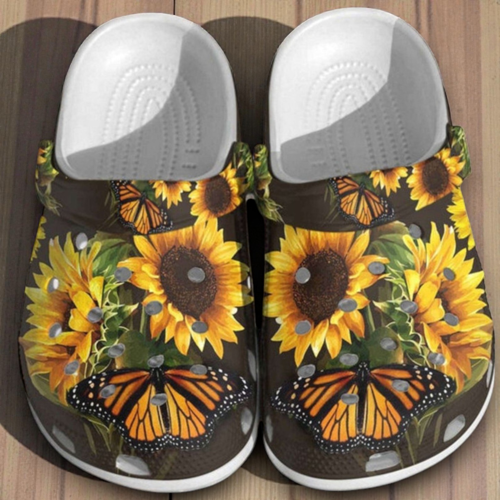 There’s something about carrying a bit of summer with you that feels right—like a quiet declaration of who you are. These Crocs wear that feeling on their surface, bursting with bright sunflowers and fluttering orange monarch butterflies across a deep, dark background. It’s a look that’s lively and unapologetically bold, yet rooted in nature’s effortless charm. The design isn’t shy. The sunflowers pop with vibrant yellows, bringing warmth and energy, while the butterflies add a delicate, whimsical touch that catches the eye. It’s footwear that doesn’t blend into the scenery but also feels perfectly at home outdoors, whether you’re wandering a garden path or settling in for a weekend barbecue. Pair these with anything from relaxed denim cutoffs to casual linen pants, or even a breezy sundress. They ground the outfit with a burst of personality and an unmistakable nod to the natural world, making them easy to weave into everyday looks. Who picks these out? Someone who loves carrying a bit of nature’s cheer wherever they go. Maybe a sunflower fan who’s found a way to turn their favorite bloom into a statement, or an outdoor enthusiast who appreciates footwear that’s both comfortable and a little bit joyful. They’re also a thoughtful gift for those who find happiness in simple, vibrant things—a small reminder to enjoy the sunshine and the little wonders fluttering by.