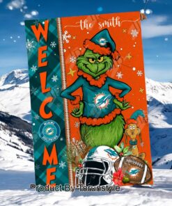 Elevate your holiday décor with a unique twist that combines festive cheer and team spirit. Picture a vibrant garden flag that not only extends a merry welcome but also showcases your Miami Dolphins pride with a playful Grinch twist. Perfect for any Dolphins fan, this customizable flag lets you add a personal touch with your name, creating a one-of-a-kind piece that stands out in your winter wonderland. This delightful blend of football enthusiasm and holiday joy is sure to spark conversations and bring a smile to the face of every passerby. Celebrate Christmas in style and make your home the talk of the neighborhood with this enchanting garden flag!