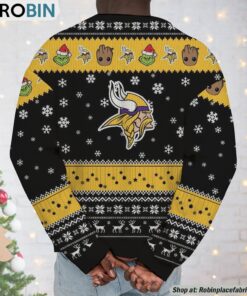 Gear up for the festive season with a fun twist on team spirit! Show off your Minnesota Vikings pride in a unique and playful way with our exclusive apparel featuring Baby Groot and the Grinch in a whimsical holiday design. Perfect for fans who want to stand out at holiday parties or while cheering for the Vikings. Our sweatshirt and sweater combine comfort, warmth, and a memorable touch of character, making them a must-have addition to your winter wardrobe. Celebrate the holidays and your favorite team with a smile!