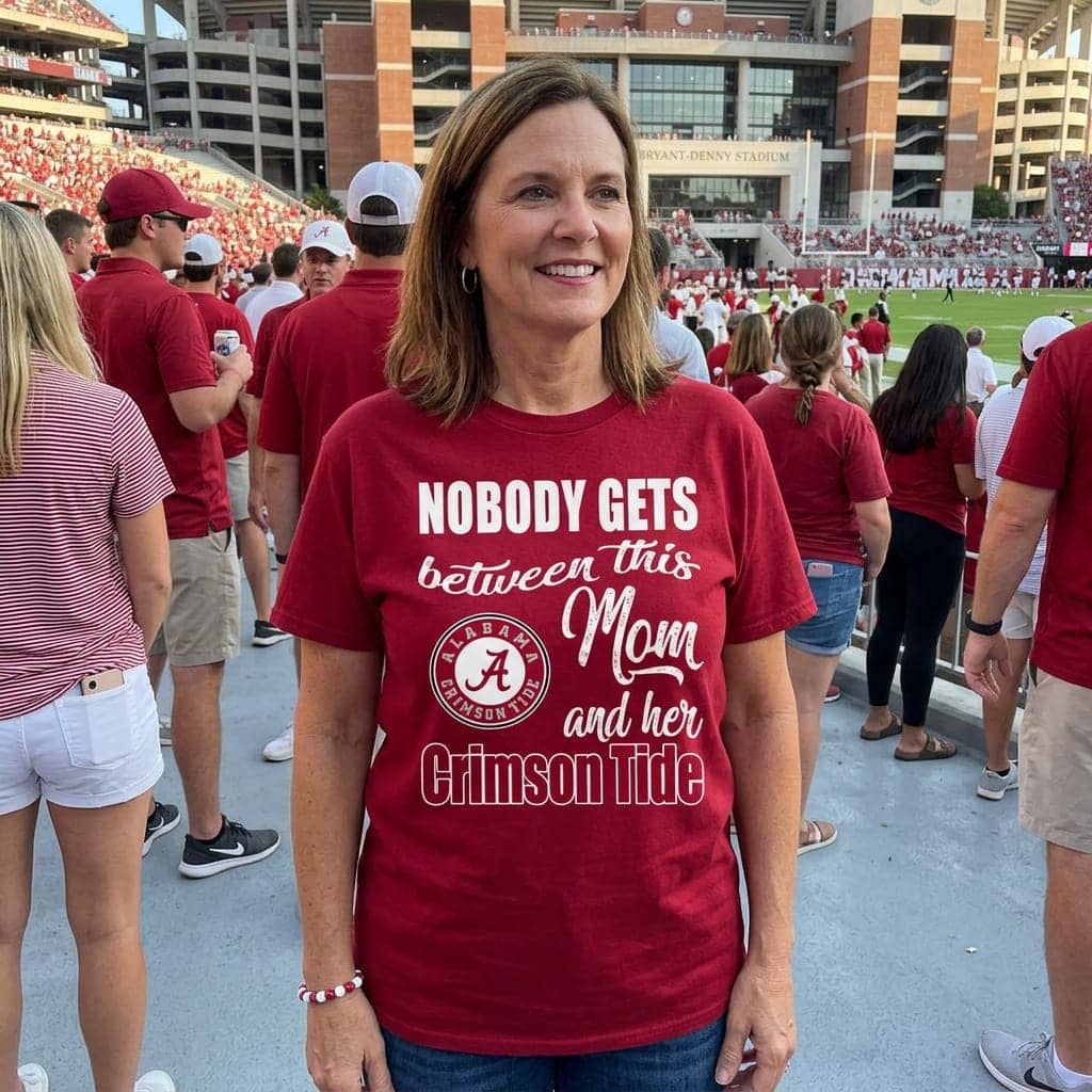A deep crimson stretches across this shirt, immediately catching the eye with a bold statement in large white sans-serif letters: “Nobody Gets Between Mom And Her Alabama Crimson Tide.” The powerful typography contrasts sharply against the rich red, making the message impossible to miss. Below the text, the Alabama Crimson Tide logo adds a collegiate authenticity, perfectly balancing pride and passion without overwhelming the design. The subtle script font used to emphasize “Mom” softens the intensity just enough to highlight the personal, heartfelt connection behind the fan fervor. This shirt isn’t just about cheering on a team; it’s a badge of honor for that fierce devotion only a mother can have. It speaks to the kind of fan who tailgates with relentless enthusiasm and carries stadium spirit every Saturday. Layer it under a varsity jacket or pair it with dark jeans and sneakers for a look that’s effortlessly spirited and ready for game day chaos. It’s ideal for the mom who proudly claims her place at the center of the fan family, someone who lives and breathes every touchdown and tackle. Whether gifted before the season kicks off or worn as a rallying cry during rivalry weekends, this shirt captures that fiery bond between family love and team loyalty. Anyone who knows the Alabama Crimson Tide’s legacy would understand just how much pride is threaded into these words—and why nobody, truly, gets between mom and her team.