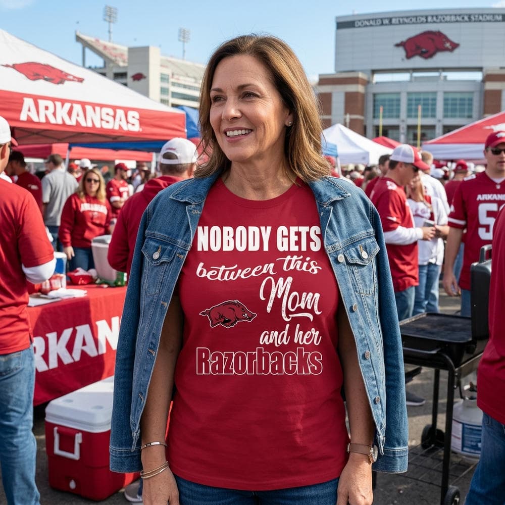The sharp red of the shirt catches the eye immediately, a color as vibrant and unmistakable as the roar of a crowd on game day. Across the chest, large block letters spell out a clear, confident mantra, while a flowing script font adds a touch of warmth and personal pride to the message. Nestled just below, the iconic Arkansas Razorbacks logo stands out in crisp detail, its aggressive stance perfectly balancing the spirited text above. Layered over denim or paired with casual jeans, the shirt blends collegiate boldness with a relaxed, everyday vibe. This design speaks directly to those who wear their fandom like a badge—not just for the love of the sport, but as a statement of identity and family connection. There’s a certain energy carried by the bold typography, combined with the playful script, that reflects a pride deeply rooted in community and tradition. It’s a piece that a mom who cheers louder than anyone in the stands would reach for, whether heading to tailgate festivities or gathering with friends for the big game. Anyone who champions the Razorbacks and embraces that mix of spirited enthusiasm and grounded loyalty would appreciate this shirt. It fits naturally into weekends filled with cheer and connection, the kind of clothing that feels like more than just fabric—it's a subtle claim, a way of saying that some things, like family loyalty and team pride, are simply untouchable.