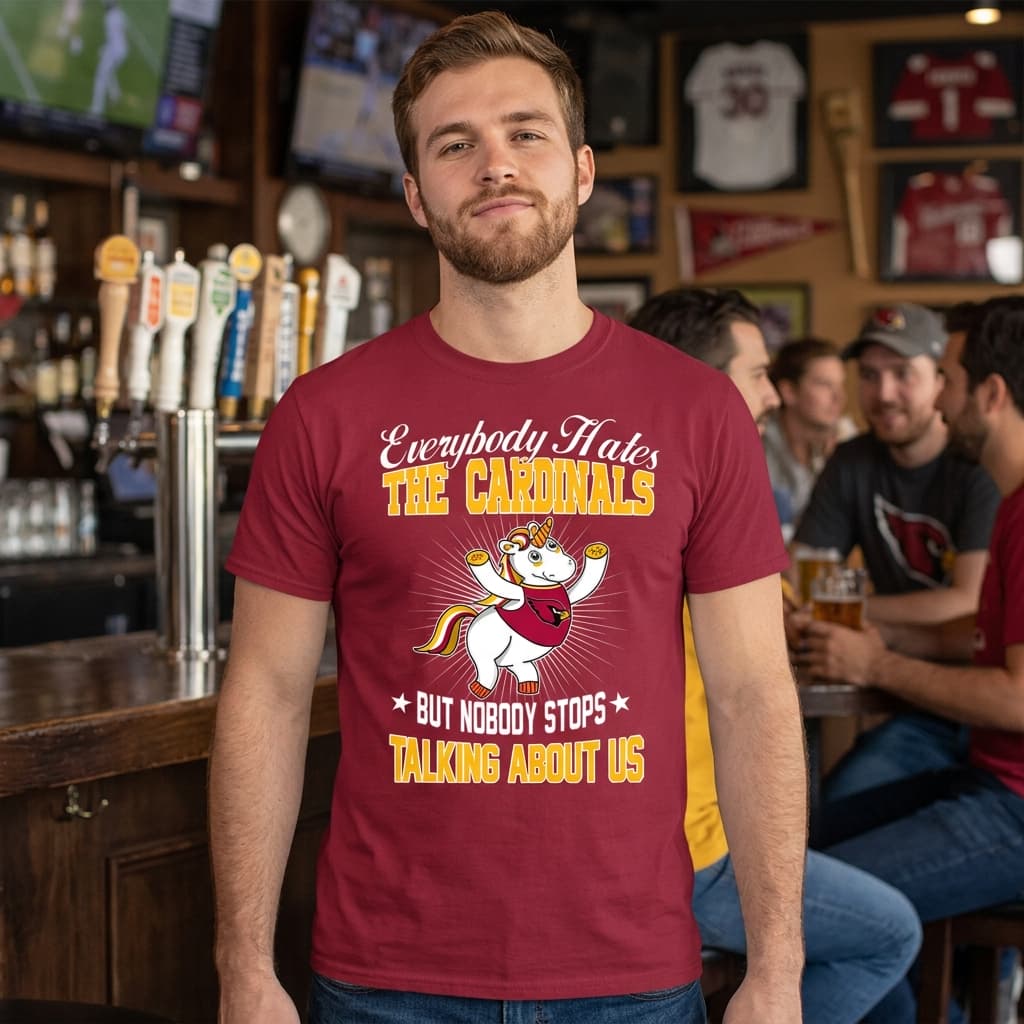 A maroon canvas bursts to life with playful energy—bold blocky varsity letters in crisp yellow and white arc confidently across the chest, demanding attention without ever shouting. Nestled beneath, a cartoon unicorn mascot adds an unexpected twist, blending humor with team spirit. Star accents punctuate the layout, subtly nodding to the bright moments fans savor during every game. The sharp contrast between the lettering and the deep maroon background brings a dynamic edge, while the mascot’s cheeky grin softens the vibe, making it clear this isn’t just mundane sports apparel. It captures a vibrant personality: passionate, a little irreverent, and fully committed to the Cardinals’ community. This shirt respects the fan who enjoys both the thrill of the game and the inside jokes shared among friends. This design feels right at home in stadium seats or casual hangouts alike. It’s the kind of piece that sparks conversations—something true fans and meme lovers will appreciate for its witty charm and bold statement. Whether it’s off-duty Fridays or game day rituals, the nobody stops talking about us Arizona Cardinals shirt effortlessly blends humor, fandom, and a touch of irreverence in its craftsmanship.
