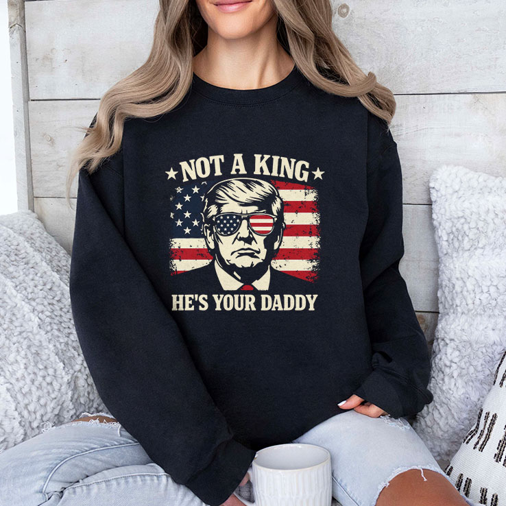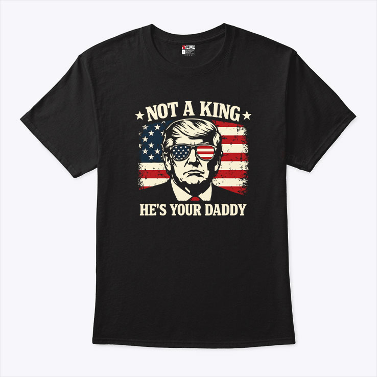 Wearing a shirt like this is a statement woven into everyday moments—whether chatting with friends over coffee or heading out to a casual gathering where politics naturally bubbles to the surface. The powerful American flag stretches out in the background, its stars and stripes worn with a vintage distress that hints at a rugged, lived-in affection. At the center, a grayscale portrait of a man sporting sunglasses adds an edge of cool confidence, anchoring the design with bold, graphic intensity. The uppercase, condensed serif typography carrying the phrase Not A King He's Your Daddy cuts through with a raw texture, almost as if it’s been stamped on, pushing a provocative and humorous tone without being over the top. This shirt carries an unapologetic vibe, blending political satire with a touch of defiance. It’s for those who don’t shy away from expressing their views—whether at backyard barbecues, political rallies, or just on the streets where conversations spark over current events. Those drawn to this design appreciate both the humor and the audacity behind it, a nod to identity and allegiance tangled with a clever bite. It fits naturally into a lifestyle where clothing is more than fabric; it’s a way to signal, laugh, and align all at once. Gifting it means handing over a piece that says, “I get what you’re about,” without a word needing to be explained.
