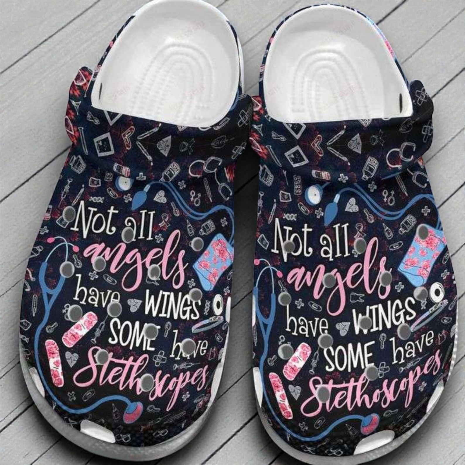 Anyone working in healthcare knows the drill: long hours, rarely getting a chance to sit down, and feet that ache by the end of the day. These "Not all angels have wings, some have stethoscopes" Crocs are a perfect little shoutout to the reality of the job. We set the pink and white lettering over a dark navy background, and packed the pattern with hand-drawn hospital essentials—blood pressure cuffs, bandages, pills, thermometers, and stethoscopes. It's a sweet, meaningful design that patients and coworkers always end up complimenting.