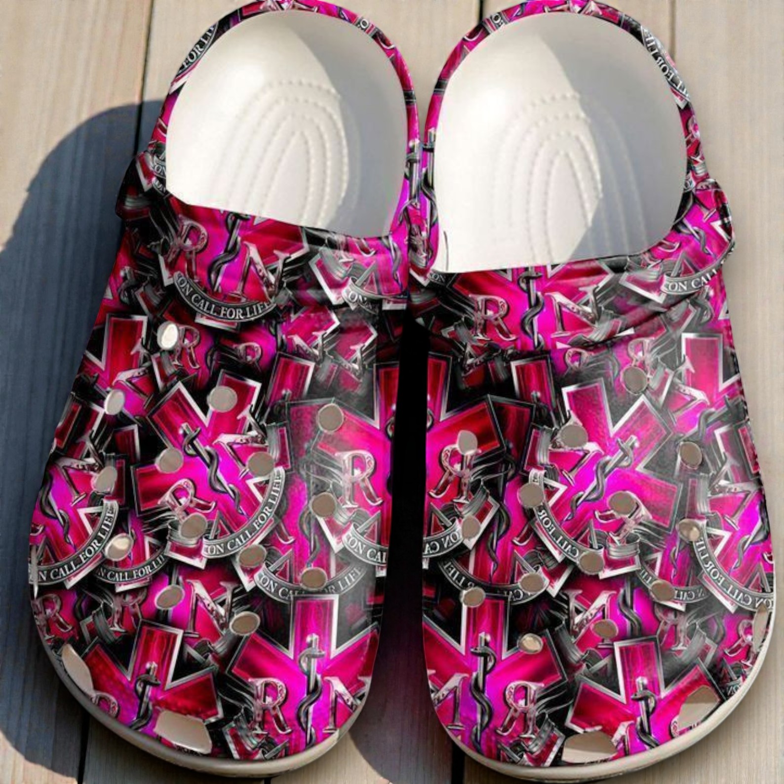 Bright magenta sweeps across these clogs in a way that immediately captures attention, turning a practical shoe into a statement piece. The background isn’t just a flat color—it’s alive with scattered Star of Life symbols, each one a crisp blue with clean lines that nod to the essential and heroic work of healthcare professionals. Medical ribbons float among the stars, adding depth and a touch of celebration, while subtle metallic accents catch the light with a quiet gleam, breaking up the vibrant pink and giving the clogs an energized, graphic pop. Inside, the crisp white interior balances the intensity outside, offering a clean, fresh contrast that hints at hygiene and care, perfectly fitting for anyone on the front lines of medicine. This design hits the sweet spot for anyone who identifies strongly with their healthcare role—these shoes don’t just hold feet; they show pride in a profession where every shift matters. The cartoonish style adds a bit of fun, keeping things lively, not stuffy, reflecting a playful side to a demanding job. These clogs are tailor-made for nurses who want their footwear to shout personality and appreciation rather than blend into the background. They’re a vibrant nod to the daily grind and grace of healthcare work, making them an ideal gift choice for colleagues or loved ones who need a burst of energy during long shifts. Whether given as a token of thanks or picked out for personal wear, they bring a spark of color and spirit to the uniform, a reminder that care can be bold and stylish all at once.