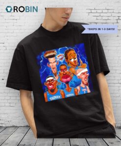 Rep your Thunder with this awesome caricature graphic shirt! Celebrate the playoff bound 2025 season with fun, unique style. A must-have for any die-hard fan showing their team spirit. Get yours now!