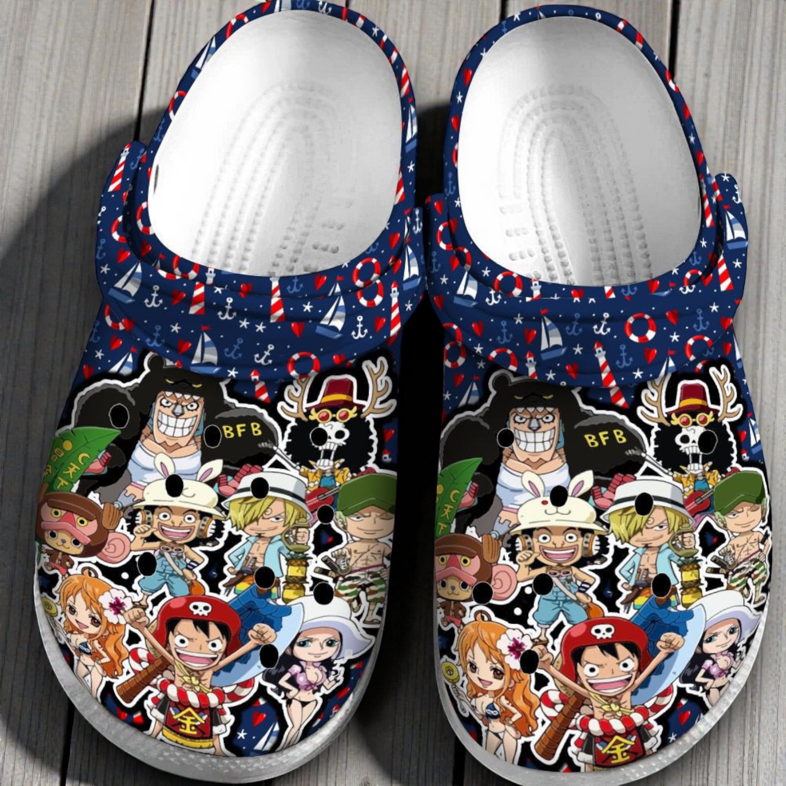 If you are caught up on One Piece (or just rewatching your favorite arcs), these custom Crocs are a fun way to bring the Straw Hat crew with you everywhere. We packed a ton of characters right onto the front—Luffy, Zoro, Sanji, Nami, Chopper, Brook, and Robin—all in a cute, chibi-style collage. To tie the whole pirate theme together, we set them against a navy blue nautical background covered in tiny lighthouses, sailboats, and anchors.