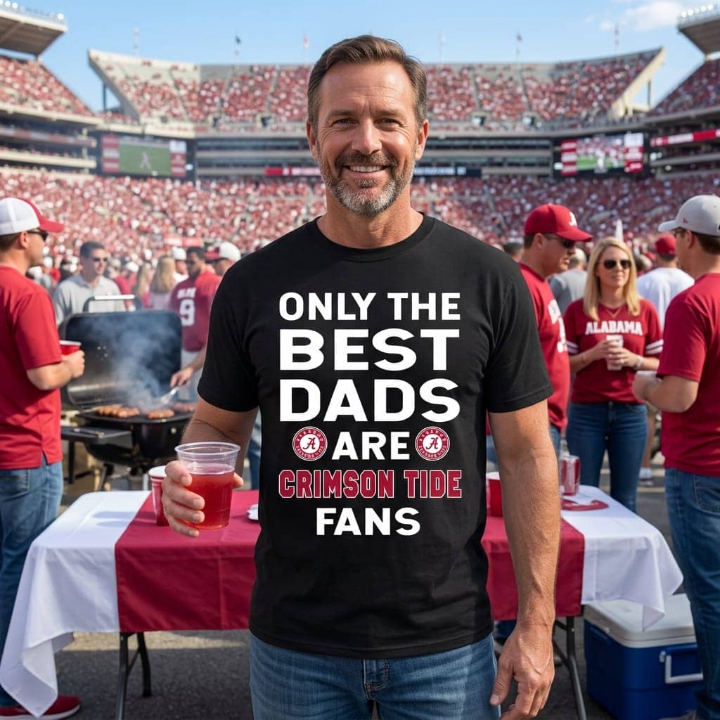Bold block letters in crisp white and crimson stretch across the fabric with a confident clarity that commands attention without shouting. The typography, all uppercase and high contrast, mirrors the intensity and pride found in a packed stadium on game day. Behind the text, a faded yet unmistakable football stadium backdrop anchors the design, infusing it with atmosphere and energy that resonates with anyone who’s cheered every thrilling moment of a Crimson Tide game. Somewhere in the composition, familiar university logos punctuate the scene, grounding the look in authentic collegiate spirit. This shirt channels more than just fandom; it captures the essence of a dad who lives for the game, whose identity is woven into the rhythm of kickoff, tailgate rituals, and roaring crowds. The bold, statement-making style speaks to someone who isn’t shy about showing allegiance—whether worn to a lively game day gathering or a casual hangout among fellow sports enthusiasts. It pairs effortlessly with well-worn jeans or a favorite cap, completing an outfit that embodies loyalty and undeniable pride. Ideal for those who wear their Crimson Tide passion as a badge of honor, this design embraces the spirited energy of fan culture while celebrating the special role dads play in that world. It’s a reminder that sometimes, the best accolades aren’t trophies but the pride we carry in the stands.