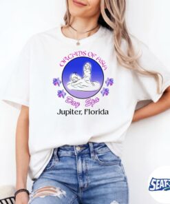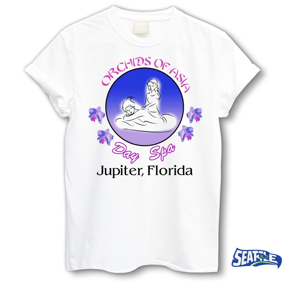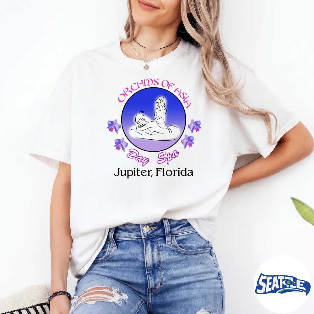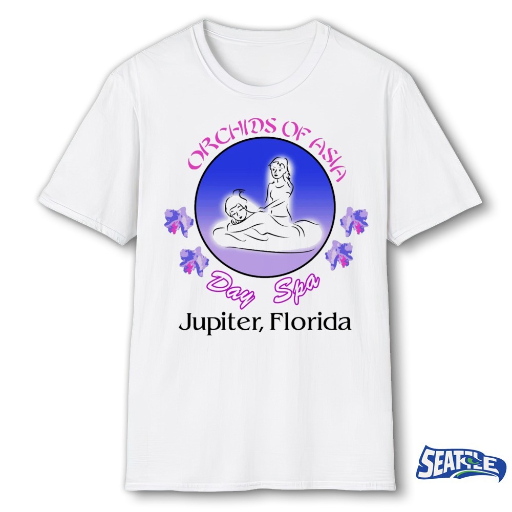 A soft, relaxed vibe shapes the essence of this shirt, where a circular graphic sits front and center, drawing the eye with its cool gradient from purple to blue. Two illustrated figures inside the circle suggest calm conversation or quiet connection, framed by subtle orchid motifs that evoke the tropical flair of a spa setting. The pink text arching over the design spells out Orchids Of Asia in a decorative sans-serif that feels both modern and graceful, while the script Day Spa adds a touch of handcrafted warmth beneath it. The grounding “Jupiter, Florida” in serif completes the visual story with a quiet nod to place, balancing the composition with an inviting ease. This isn’t just a t-shirt—it’s a nod to those who carry a sense of sanctuary with them, whether it’s through wellness rituals or a yearning for tropical calm. Spa enthusiasts, travelers who treasure moments of relaxation by the sea, or anyone drawn to a blend of nature’s delicate beauty and thoughtful design will recognize something familiar in this piece. It’s the kind of shirt that settles effortlessly into daily life—whether paired with laid-back jeans on a casual weekend or wrapped up as a thoughtful reminder of a trip to Jupiter, Florida. Quietly stylish and rooted in a culture of self-care, it wears as naturally as the orchid blooms it celebrates.