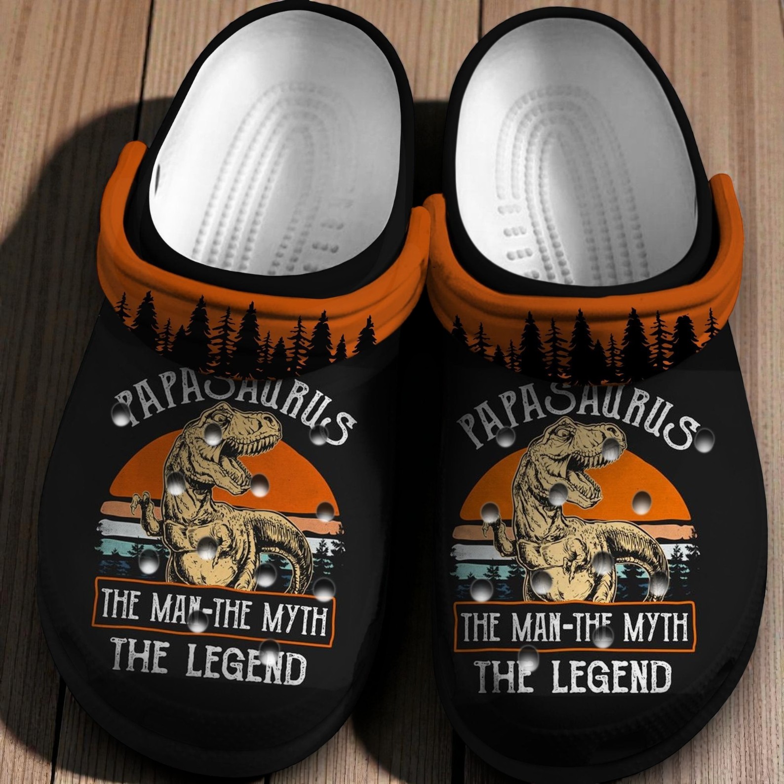 The rich orange collar frames a bold dinosaur silhouette set against a fading sunset circle, its jagged forest outlines lending a wild edge that feels both nostalgic and untamed. Blocky, distressed typography sprawls across the top and bottom, shouting “Papasaurus The Man The Myth The Legend” in all caps with a playful roughness that doesn’t take itself too seriously. This design rides the line between retro adventure and cheeky humor—like a badge worn proudly by someone who knows their own worth and isn’t shy about celebrating it. There’s a story woven in these graphics—an ode to larger-than-life personalities who enjoy a bit of playful myth-making without losing touch with everyday quirks. These slippers suit anyone who appreciates fun with a dash of ruggedness, whether they spend weekends lost in the woods or simply enjoy lounging with something a little different on their feet. The dinosaur figure and earthy hues ground the design in a rugged outdoor vibe, while the vibrant orange collar keeps it fresh and eye-catching. It’s more than just novelty footwear; it’s a nod to identity, a conversation starter for men and boys who embrace their unique sense of humor and aren’t afraid to stand out. A gift that lands well for birthdays or casual hangouts, these slippers quietly blend comfort with personality for those who value originality in even the smallest details.