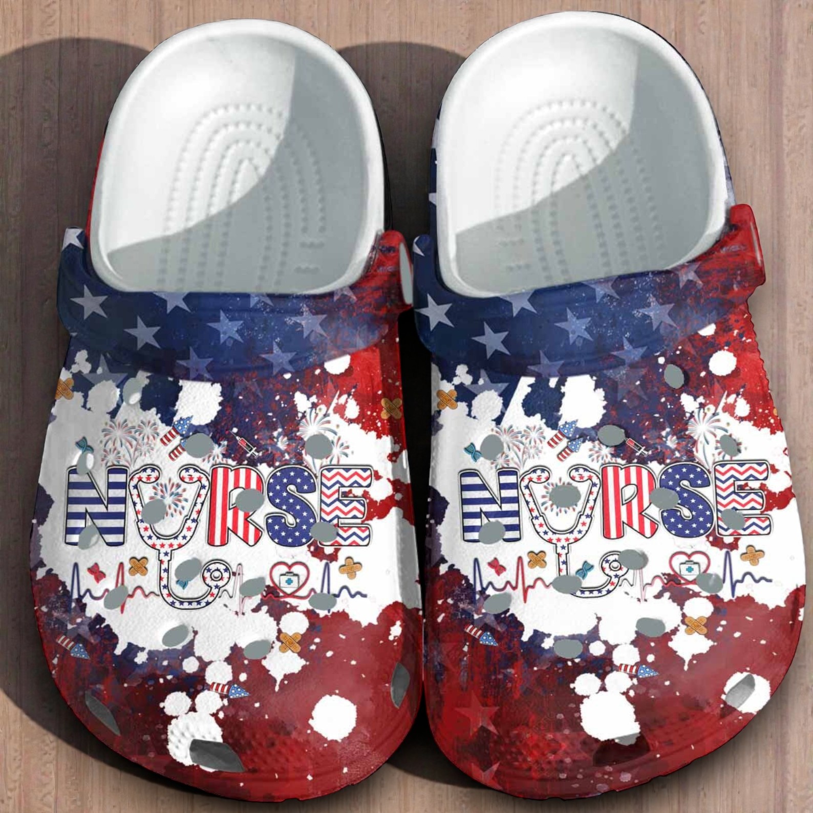 These custom Crocs are the ultimate tribute to the American nurse. The design bursts with energy, featuring a vibrant red and blue paint splatter effect over a white background, reminiscent of holiday fireworks. The word "NURSE" takes center stage in bold block letters, with each character showcasing a different patriotic pattern of stars, stripes, and chevrons.