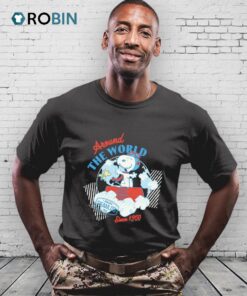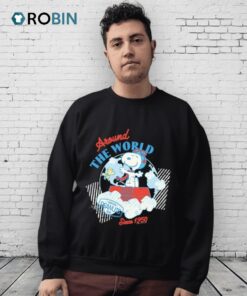Travel the globe with Snoopy and his feathered friend! This adorable shirt features the iconic duo on a worldly adventure. Perfect for Peanuts fans and jet-setters alike. Grab yours now and let the wanderlust begin! 🌍✈️
