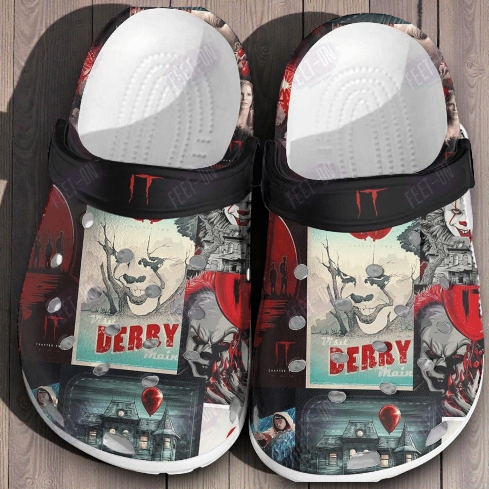 When you look closely, you'll see a few different versions of Pennywise the Clown mixed in with a retro "Visit Derry Maine" poster. It also features the creepy house on Neibolt Street and Georgie in his raincoat with the iconic red balloon. We even put the red "IT" logo right on the black heel straps. It’s a genuinely creepy, highly detailed look that other horror fans will immediately recognize.