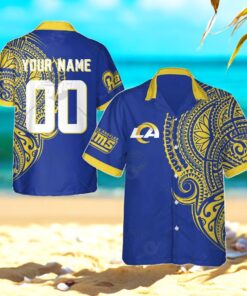 Step into a realm of vibrant cultural fusion and team spirit with a striking garment that embodies both the fierce energy of the gridiron and the intricate artistry of Polynesian tattoo designs. This Hawaiian shirt masterfully intertwines the iconic imagery of the Los Angeles Rams with the rich symbolism and striking patterns of Polynesian culture, making it a must-have for any devoted fan seeking to stand out in style. Perfect for game days, beach outings, or casual gatherings, this shirt offers a unique blend of fashion and fandom, allowing you to celebrate your favorite team in an unforgettable way. The fusion of cultural motifs with bold team colors creates a dynamic and versatile piece that's sure to become a favorite in your wardrobe.