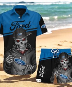 Personalized Ford Branch Skull Premium Mix Black Navy Hawaiian Shirt