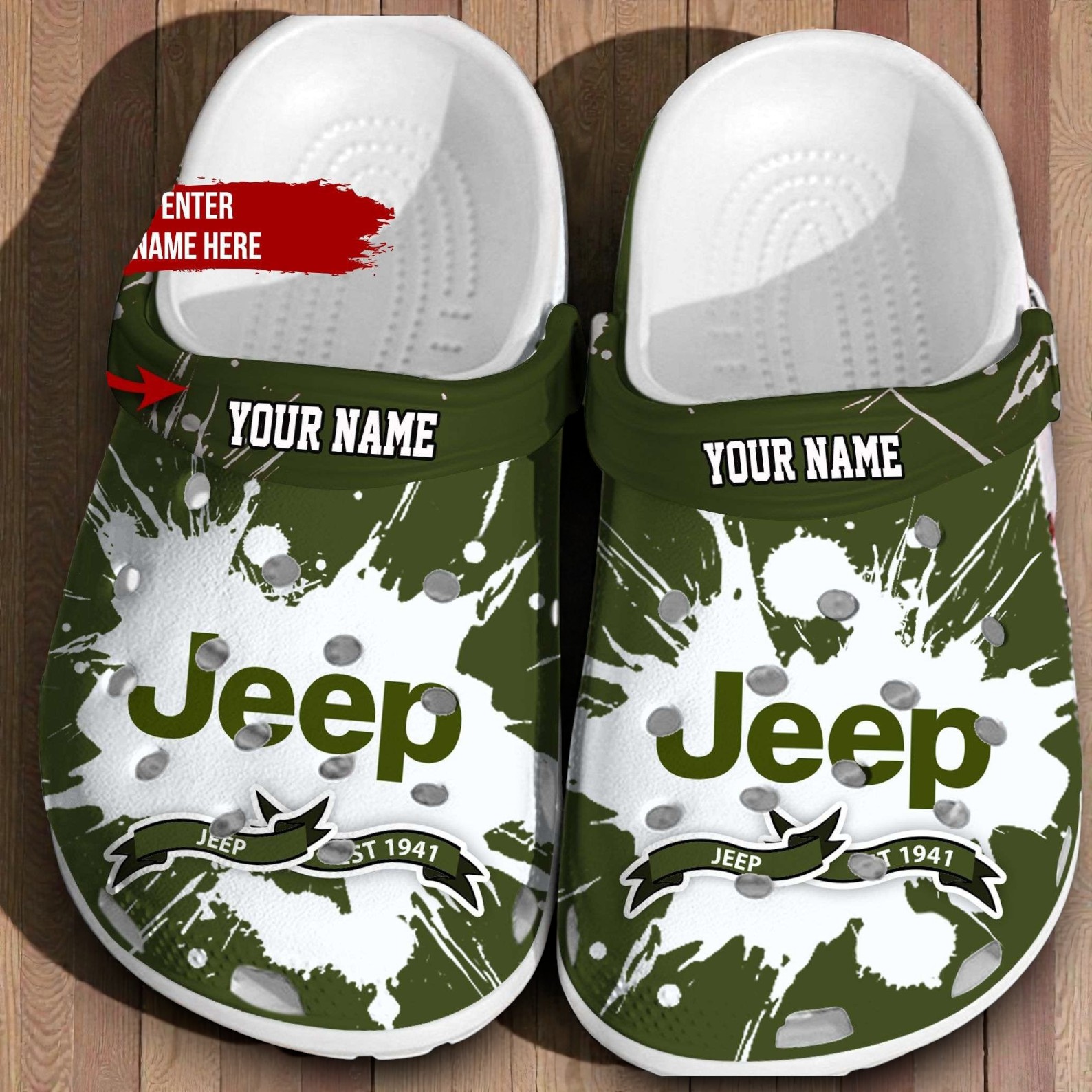 We know Jeep life is all about getting a little dirt on the tires, so we made a pair of shoes to match that exact energy. These Crocs feature a deep olive green base covered in a white mud-splatter effect. Right on the front, you've got the bold Jeep logo and the classic "Est 1941" vintage banner. It’s a great, outdoorsy aesthetic that lets everyone know what you drive, even when you aren't behind the wheel.