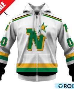This hoodie is a perfect way to show your love for the Minnesota North Stars. It features the team’s unique style and colors, making it a standout piece in your wardrobe. The jersey style design adds a sporty touch, while the personalized touch makes it even more special. The high-quality materials ensure comfort and durability, making it a must-have for any hockey fan. Whether you’re at the game or just out and about, this hoodie is sure to turn heads.