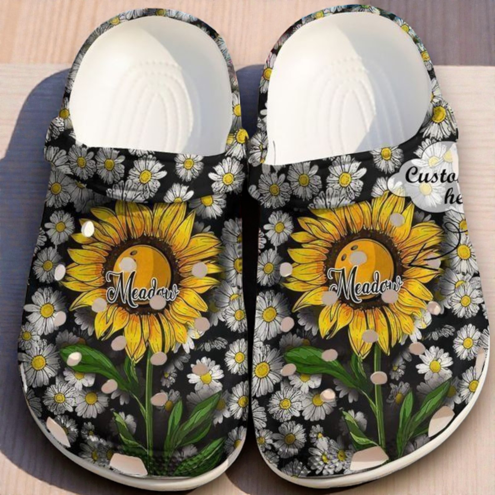 Bring a bit of the garden with you wherever you go. These black Crocs are covered in a charming field of small white daisies that wrap around the entire shoe. To make them even more special, a large, vibrant yellow sunflower sits right in the center of each shoe.
