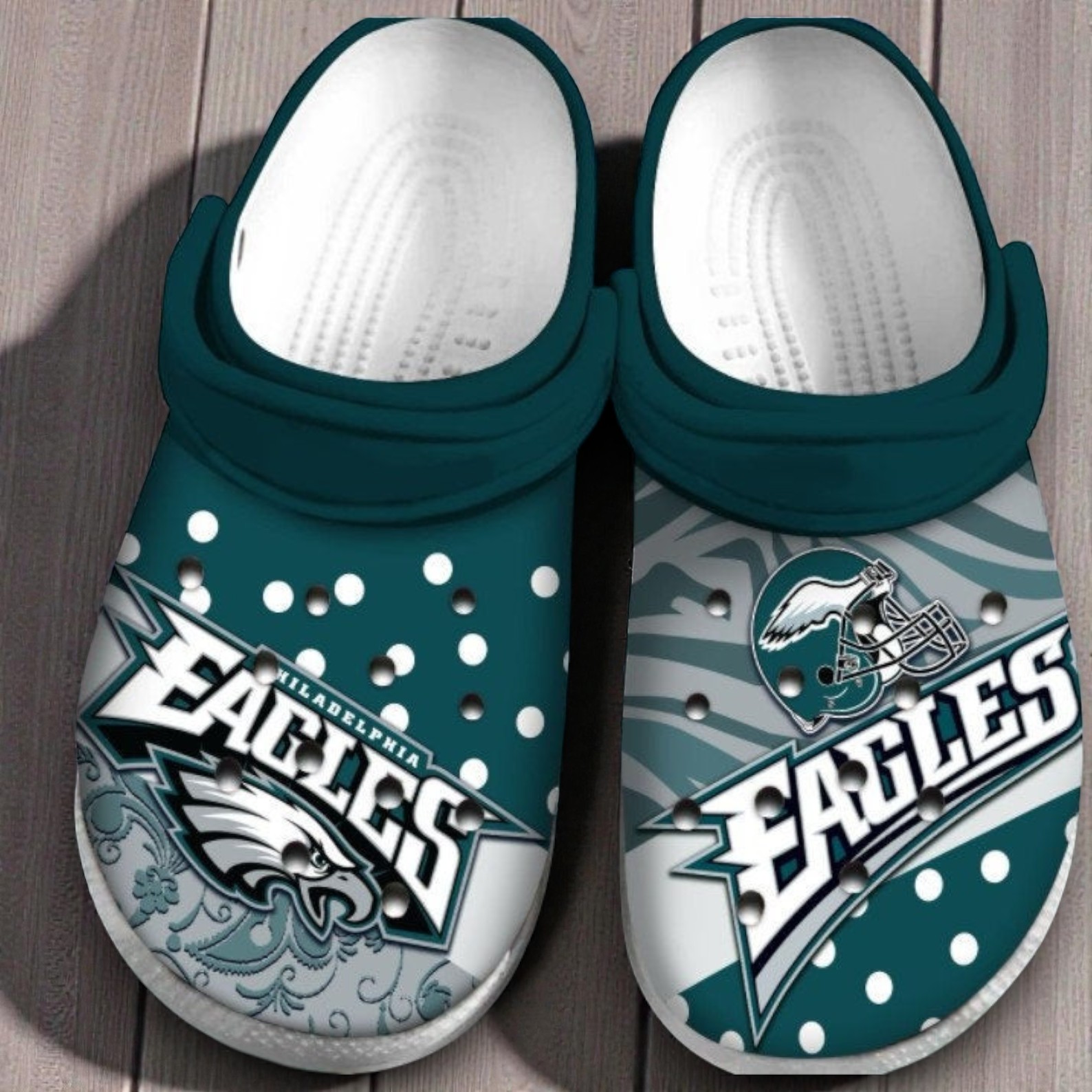 We made sure to pack this design with plenty of team pride. Set against that classic midnight green and white, one shoe features the fierce Eagles bird logo over a subtle paisley print, while the other highlights the team helmet over a cool zebra stripe pattern. We even threw in some polka dots to give it a totally unique, custom look that stands out from standard team merch.