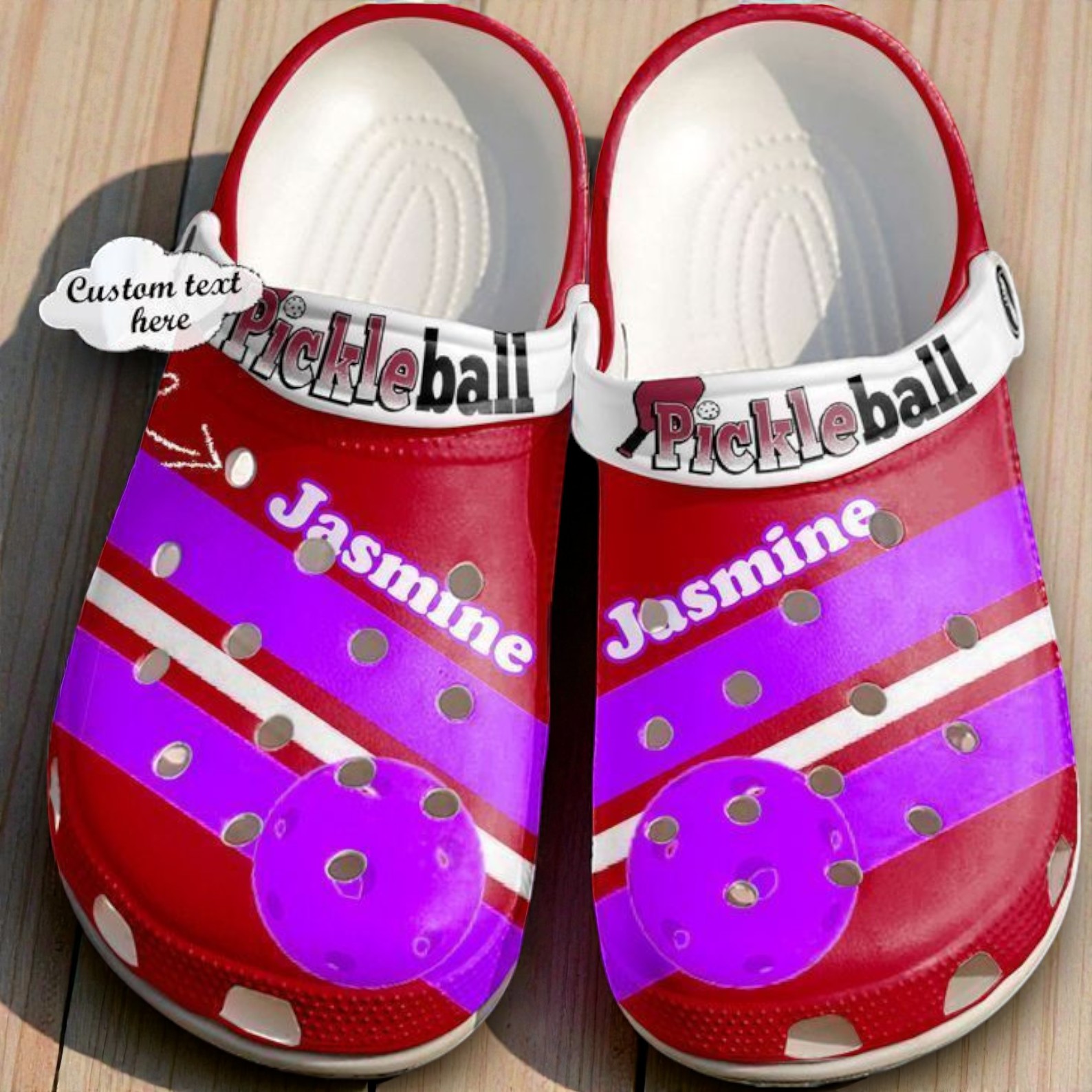 Bright red dominates the base of these clogs, interrupted playfully by bold purple stripes that suggest motion and energy, much like the rapid volley of a pickleball rally. The white strap curves across the top, branded simply with the word Pickleball in clean, rounded sans-serif letters that pop against the vibrant backdrop. Circular dotted holes punctuate the surface, evoking the textured balls familiar to anyone who’s spent a sunny afternoon on the court. Adding a personal touch, a cloud-shaped text area invites custom names in crisp white text set against purple bands, grounding the design in individuality while keeping the sporty theme front and center. These shoes don’t just look spirited—they wear like a statement for those who carry pickleball not just as a hobby but as a shared passion. The bold graphic energy perfectly complements the playful competitiveness that defines couples or individuals united by their love of the game. Whether heading to a casual match or simply lounging post-play, they strike a balance between personality and comfort. The pickleball personalized clogs make sense for anyone who treasures the sport’s sociable spirit and dynamic pace. They’re a subtle nod to that community without needing words—just a flash of color and familiar shapes. A thoughtful gift, they fit right into the rhythm of an active lifestyle, celebrating moments on and off the court with the same lively flair.