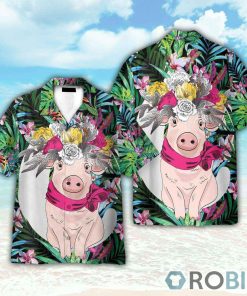 Pig With Flower Hair Wreath Tropical Pattern Hawaiian Shirt features