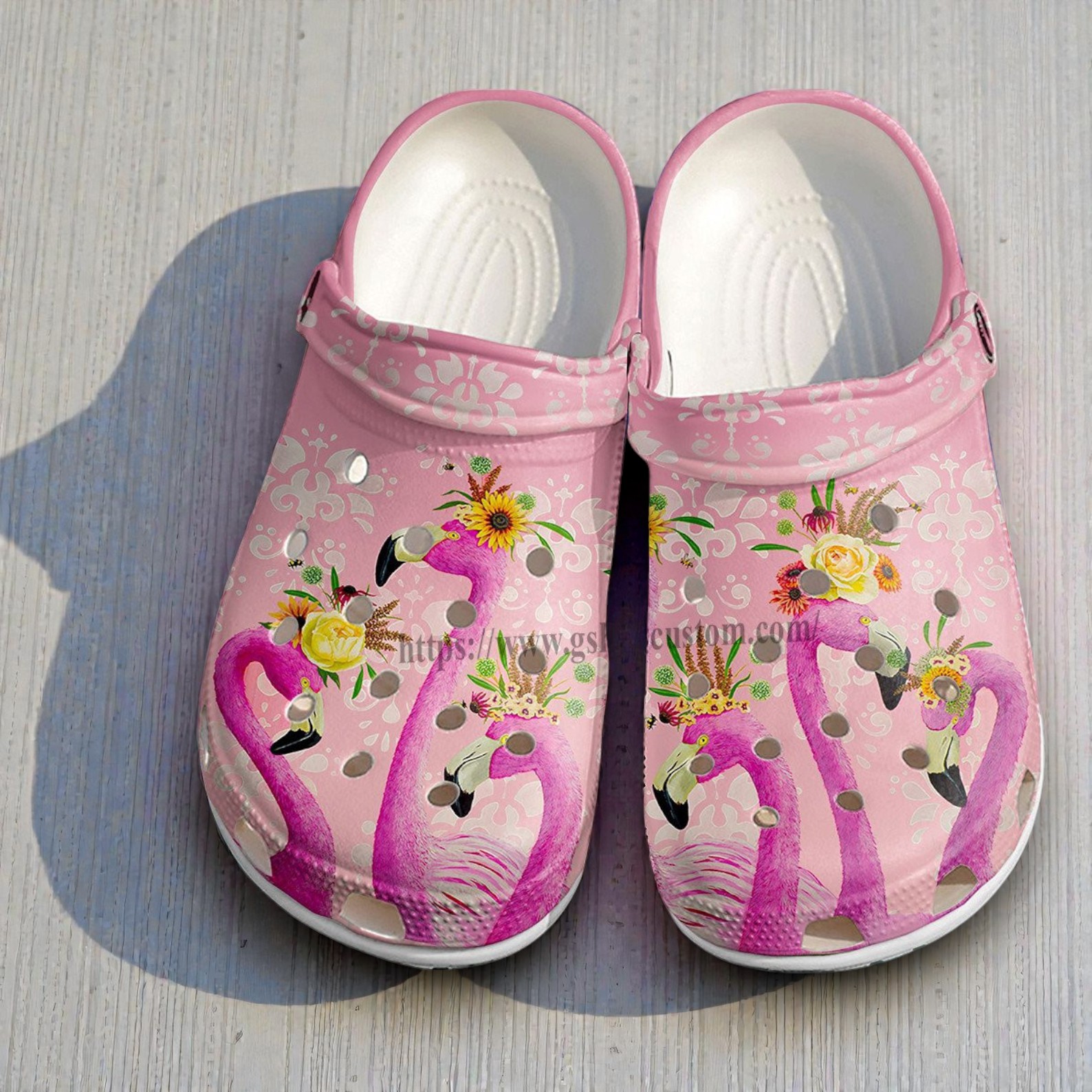 The design is soft and elegant, featuring a pastel pink background with a classic white damask pattern. The main attraction is the beautiful pink flamingos, each wearing a lovely crown of yellow sunflowers and roses. It is a sweet, stylish look that feels like a vacation for your feet.