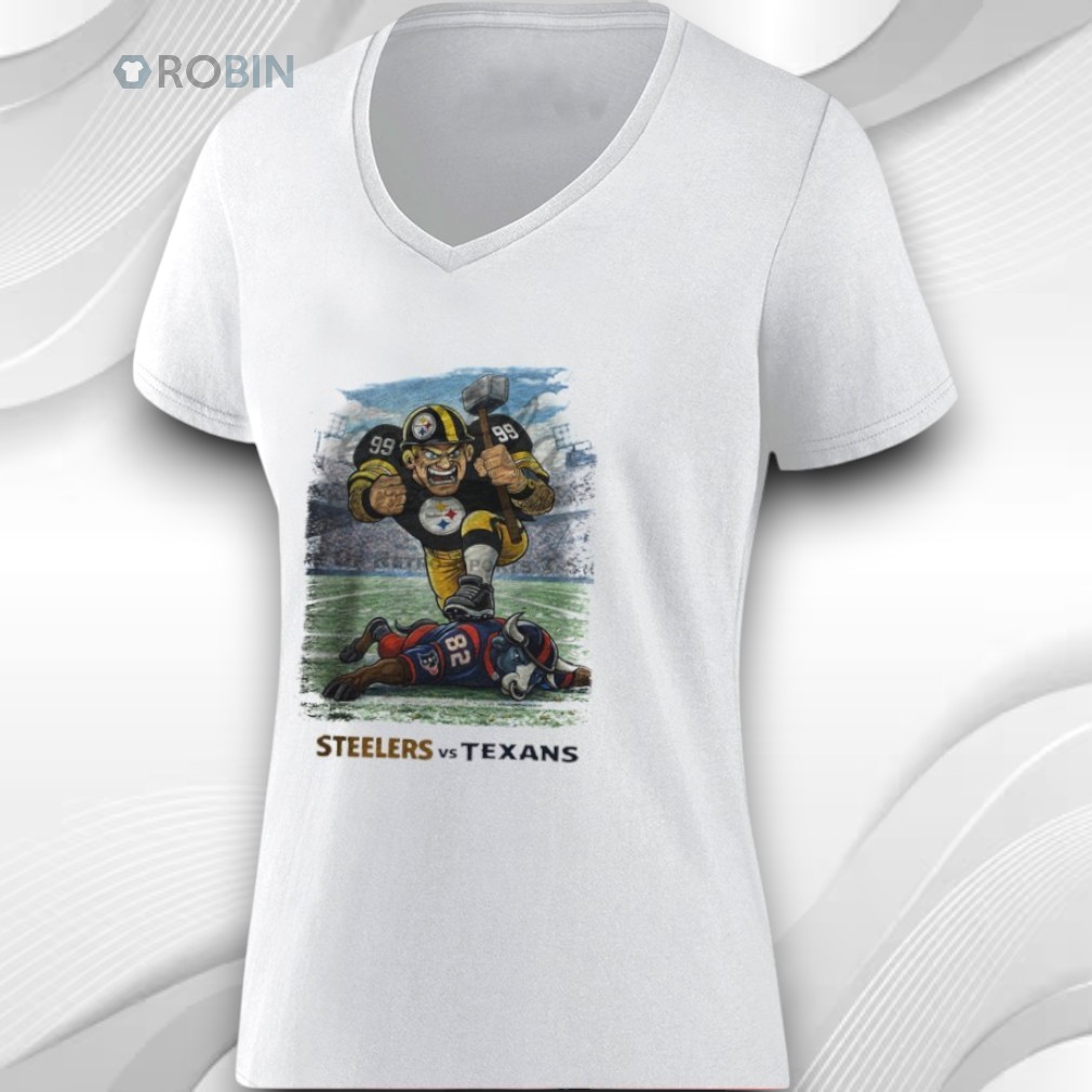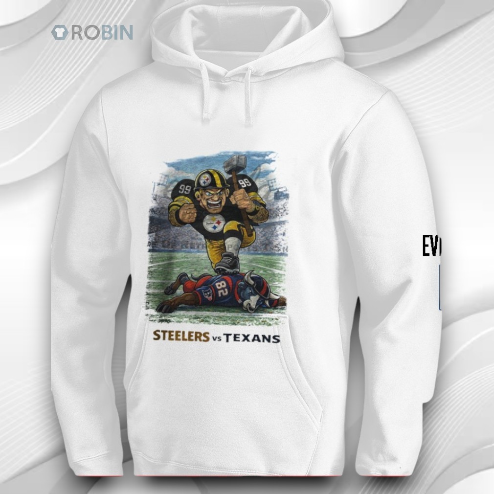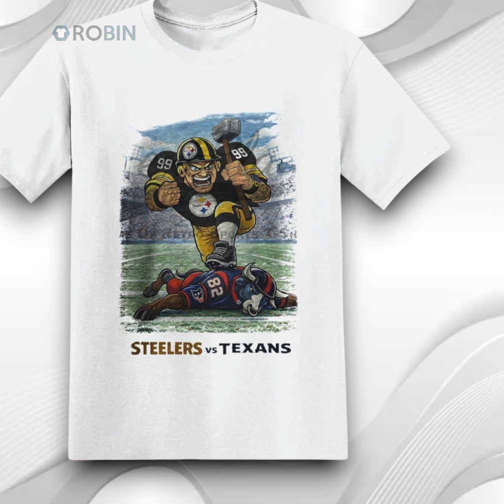 This bold, high-energy design captures the intensity of Pittsburgh Steelers vs Houston Texans in a powerful, cartoon-style showdown. Featuring a fierce Steelers player wearing #99 charging forward with unstoppable force, the artwork symbolizes strength, grit, and total game-day domination as the Texans defender is left behind.